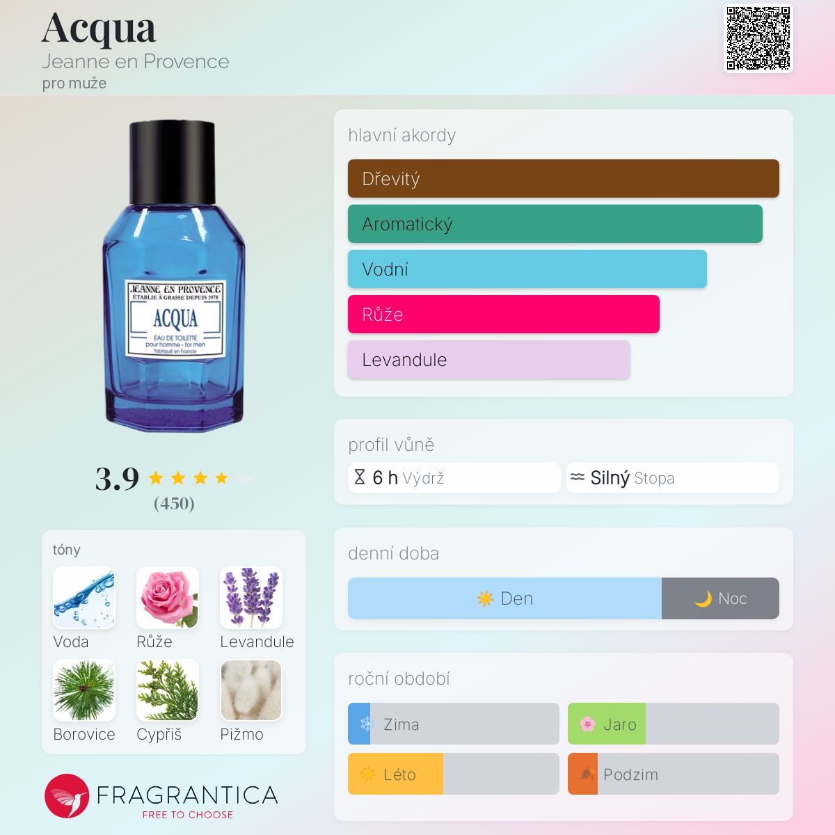 Acqua podle Jeanne en Provence je Aromatic Aquatic vůně pro muže. Acqua byl/a uveden/a v roce 2015. "Nosem" za touto vůní je Remi Barbier. Vrchní tóny jsou Vodnaté tóny a Růže; střední tóny jsouLevandule, Borovice, Cypřiš a Šalvěj muškátová ; základní tóny jsou Bílé pižmo, Mech a Santalové dřevo.