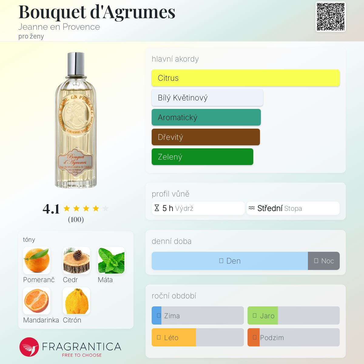 Bouquet d'Agrumes podle Jeanne en Provence je Citrus Aromatic vůně pro ženy. Bouquet d'Agrumes byl/a uveden/a v roce 2012. Vrchní tón je Mandarinka ; střední tóny jsouPomeranč a Citrón ; základní tóny jsou Cedr a Máta.