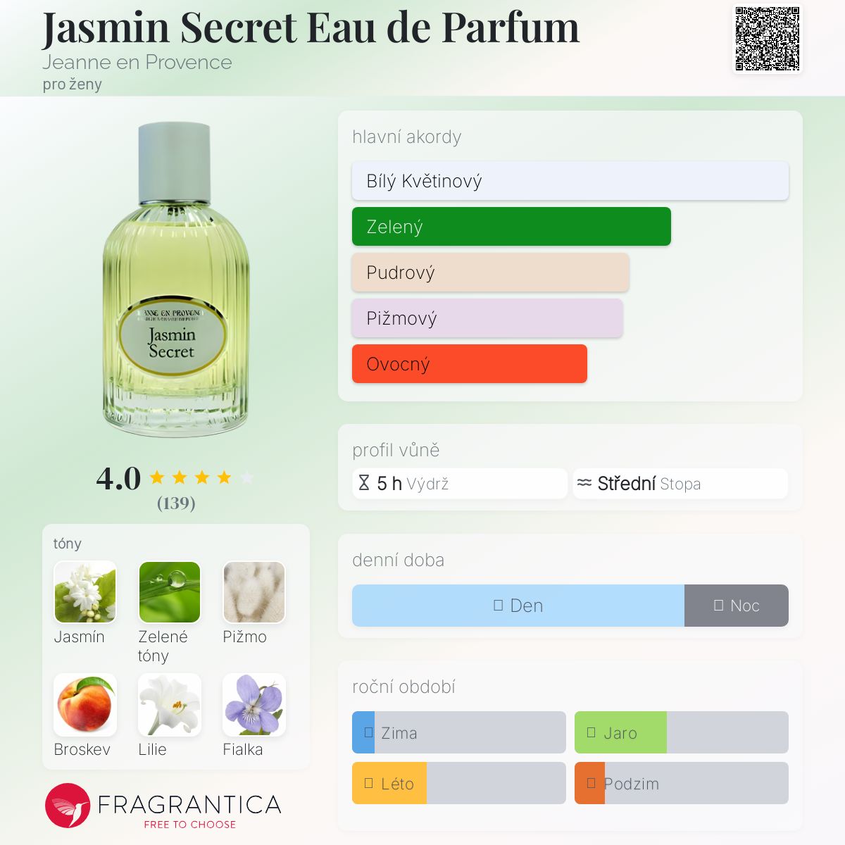Jasmin Secret Eau de Parfum podle Jeanne en Provence je Floral Woody Musk vůně pro ženy. Jasmin Secret Eau de Parfum byl/a uveden/a v roce 2019. Vrchní tóny jsou Zelený tón a Broskev; střední tóny jsouDivoký jasmín, Bílá lilie a Fialka ; základní tóny jsou Pižmo a Santalové dřevo.