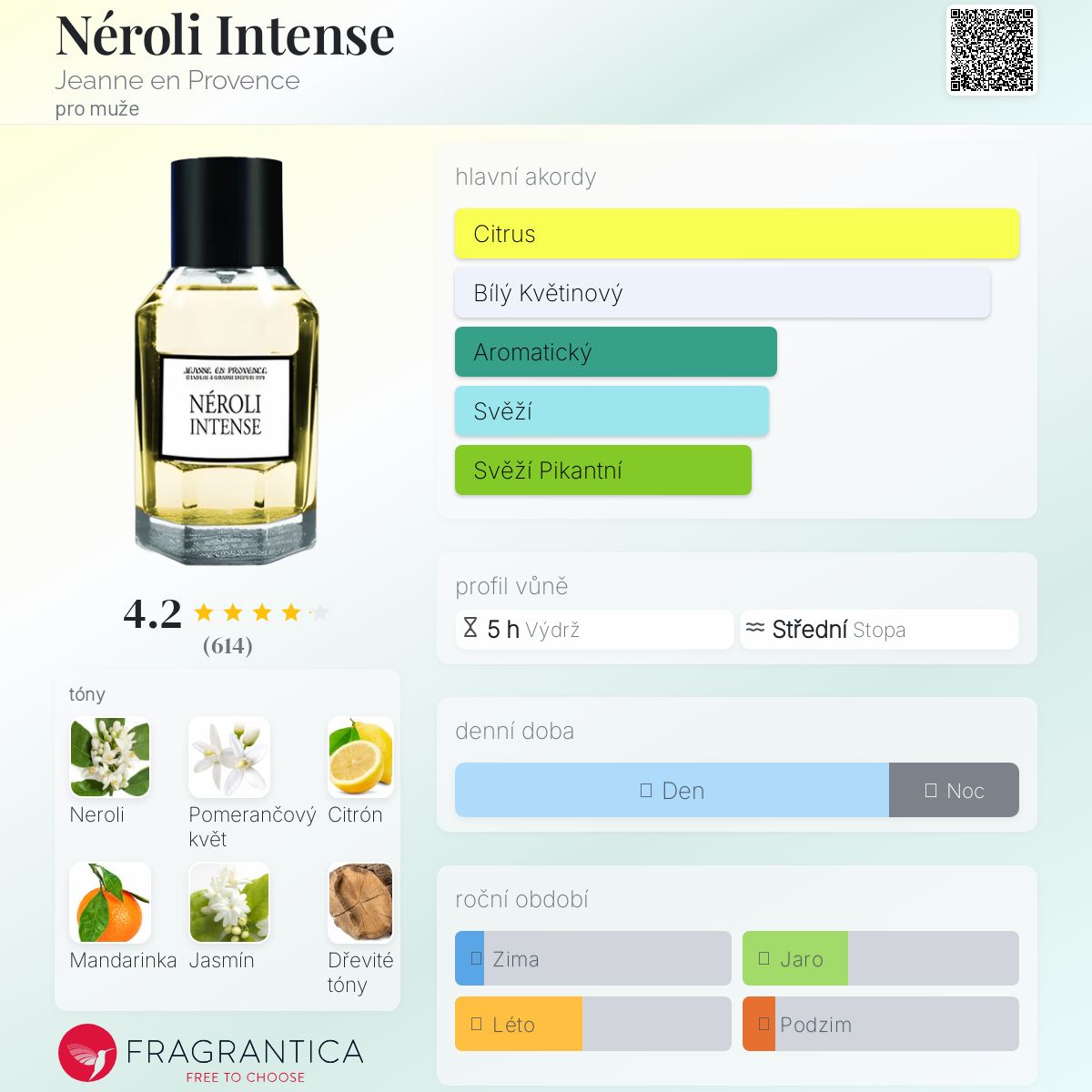 Néroli Intense podle Jeanne en Provence je Citrus Aromatic vůně pro muže. Néroli Intense byl/a uveden/a v roce 2019. Vrchní tóny jsou Citrón, Mandarinka a Rozmarýn; střední tóny jsouNeroli, Pomerančový květ a Jasmín ; základní tóny jsou Dřevité tóny a Jantar (ambra).