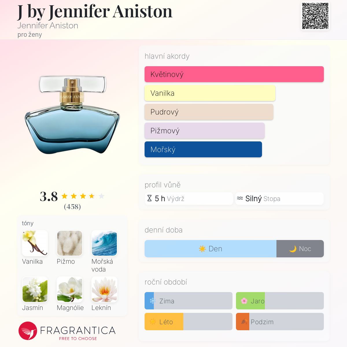 J by Jennifer Aniston podle Jennifer Aniston je Floral Aquatic vůně pro ženy. J by Jennifer Aniston byl/a uveden/a v roce 2014. Vrchní tóny jsou Mořské tóny, Leknín a Bergamot; střední tóny jsouJasmín Sambac, Magnólie a Frézie ; základní tóny jsou Tahitská vanilka, Pižmo a Santalové dřevo.