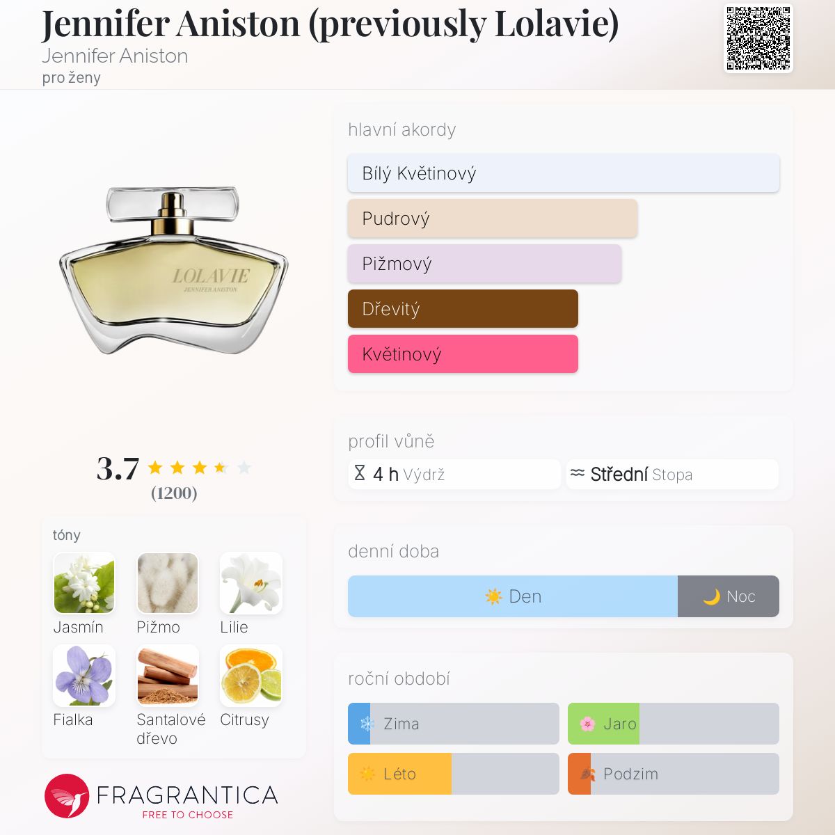 Jennifer Aniston (previously Lolavie) podle Jennifer Aniston je Floral vůně pro ženy. Jennifer Aniston (previously Lolavie) byl/a uveden/a v roce 2010. Vrchní tóny jsou Citrusy a Růže; střední tóny jsouJasmín, Lilie a Fialka ; základní tóny jsou Pižmo, Santalové dřevo a Jantar (ambra).