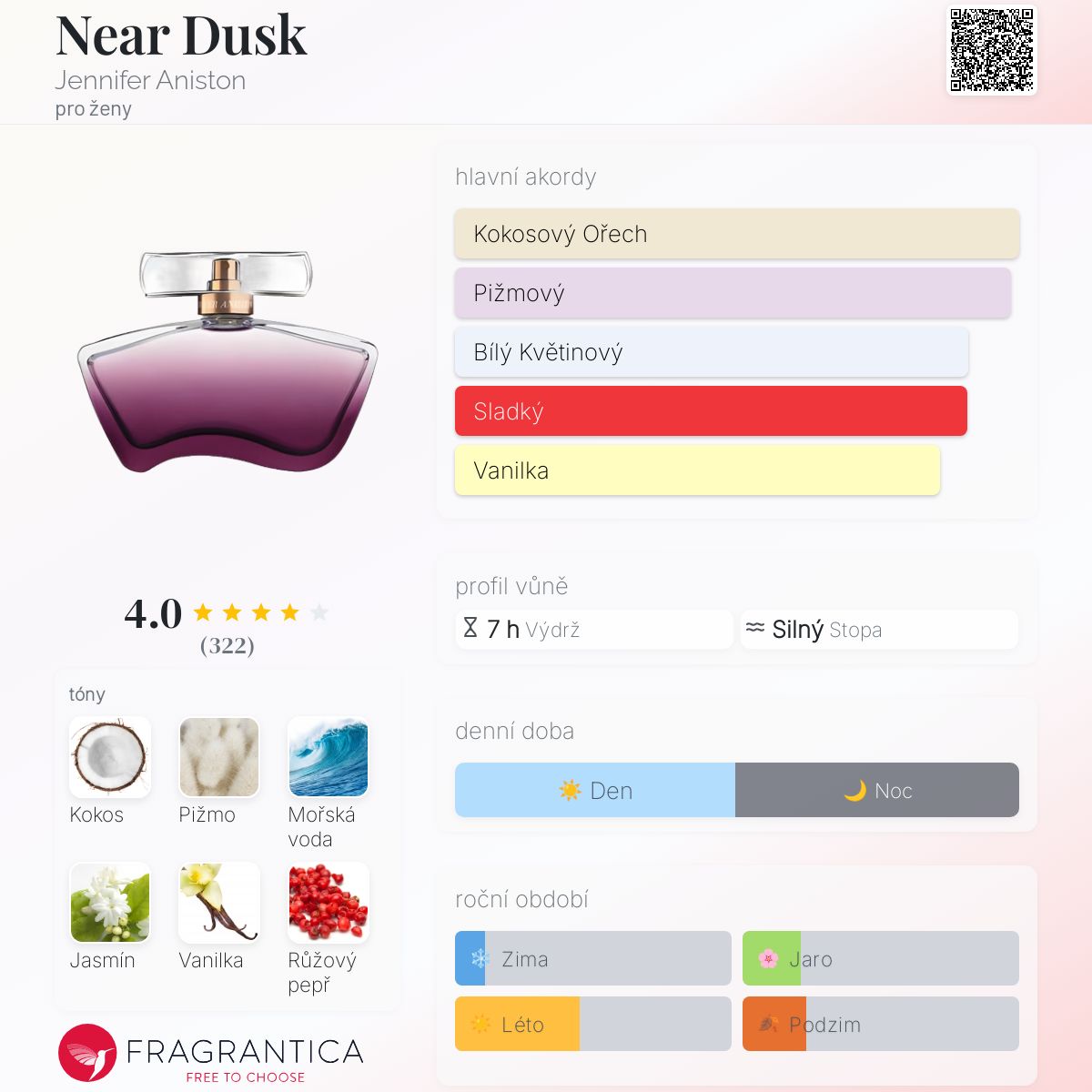 Near Dusk podle Jennifer Aniston je Floral Woody Musk vůně pro ženy. Near Dusk byl/a uveden/a v roce 2015. "Nosem" za touto vůní je Jean-Marc Chaillan. Vrchní tóny jsou Kokos, Mořské tóny, Růžový pepř a Nektarinka; střední tóny jsouJasmín, Pivoňka a Pomerančový květ ; základní tóny jsou Pižmo, Vanilka, Bílý jantar (ambra) a Bílé dřevo.