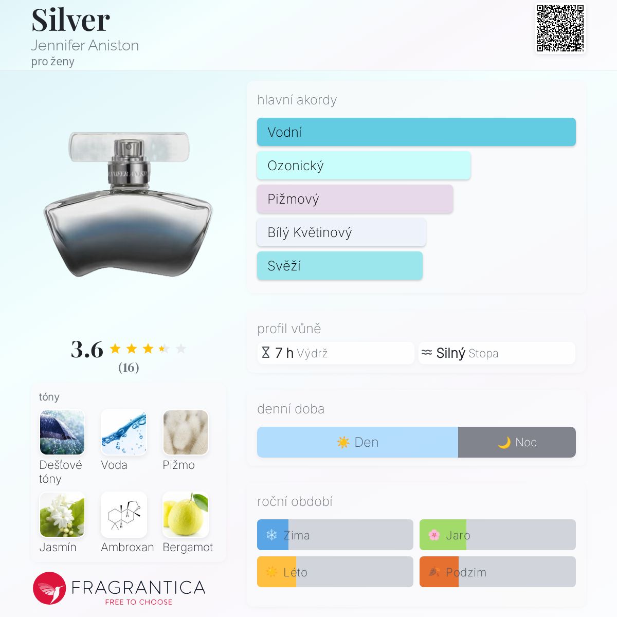 Silver podle Jennifer Aniston je vůně pro ženy. Silver byl/a uveden/a v roce 2020. Vrchní tóny jsou Dešťové tóny a Bergamot; střední tóny jsouVodnaté tóny, Jasmín a Okvětní lístky růží ; základní tóny jsou Pižmo, Ambroxan, Cedr a Vanilka.