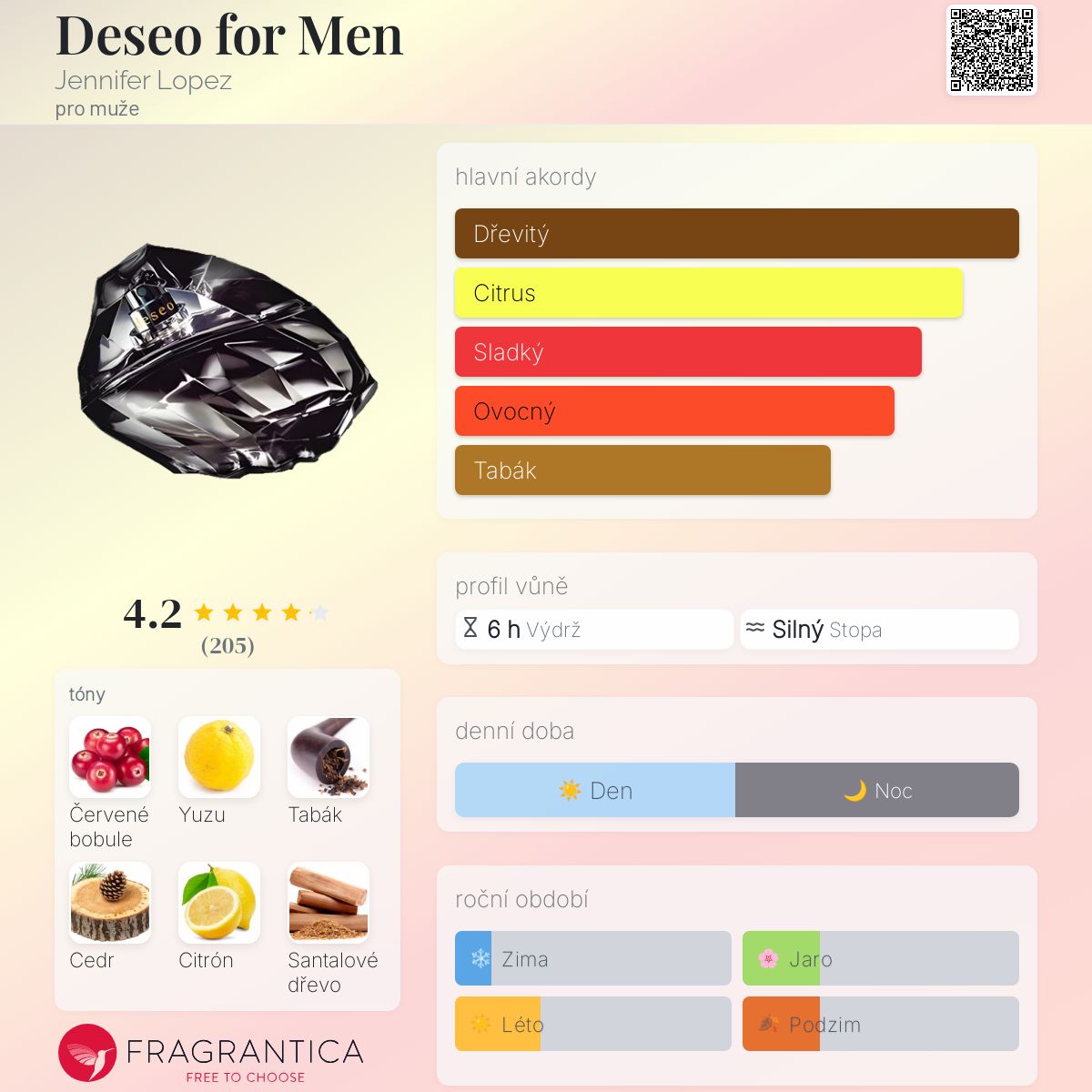 Deseo for Men podle Jennifer Lopez je Woody Aromatic vůně pro muže. Deseo for Men byl/a uveden/a v roce 2008. Deseo for Men byl/a vytvořen/a Ellen Molner a James Krivda. Vrchní tóny jsou Červené bobule, Yuzu, Cedr a Citrón; střední tóny jsouTabákový list, Guajakové dřevo a Kořen kosatce ; základní tóny jsou Santalové dřevo, Pačuli, Jantar (ambra) a Vanilka.