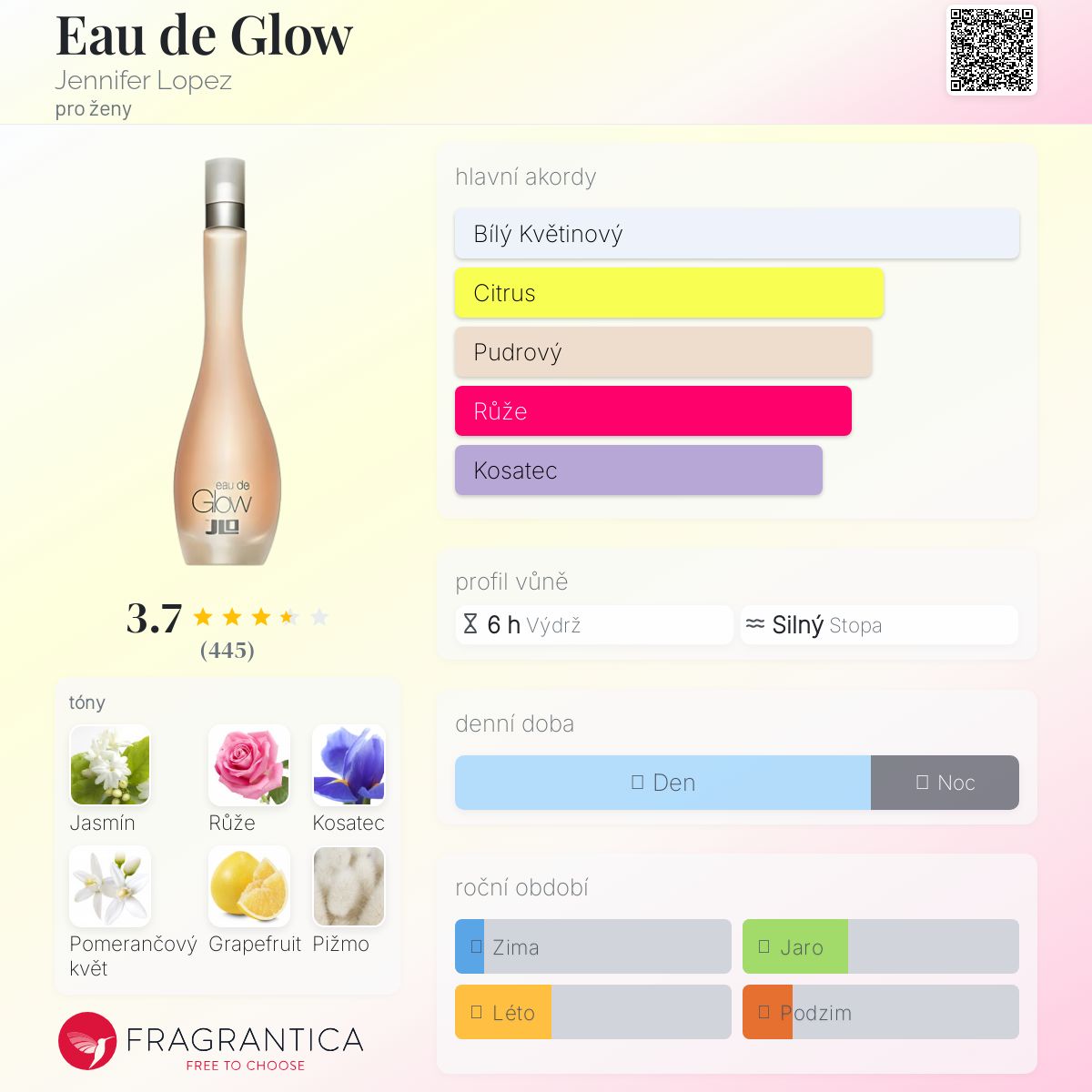 Eau de Glow podle Jennifer Lopez je Floral vůně pro ženy. Eau de Glow byl/a uveden/a v roce 2012. Vrchní tóny jsou Květ afrického pomeranče a Grapefruit; střední tóny jsouJasmín, Růže, Kosatec a Vanilka ; základní tóny jsou Pižmo, Jantar (ambra) a Santalové dřevo.