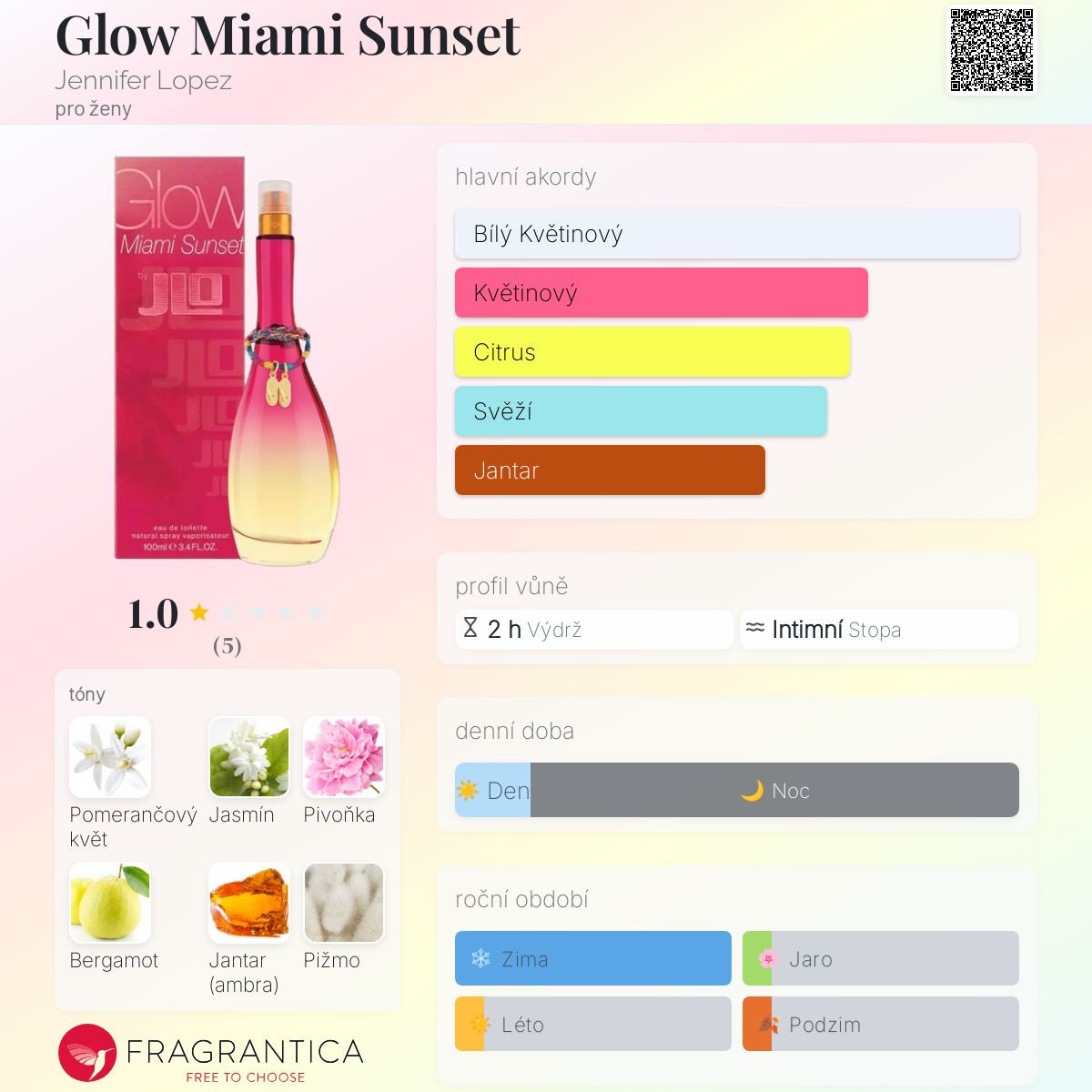 Glow Miami Sunset podle Jennifer Lopez je Floral Fruity Gourmand vůně pro ženy. Toto je nová vůně. Glow Miami Sunset byl/a uveden/a v roce 2025. Vrchní tóny jsou Bergamot, Hruška a Maliny; střední tóny jsouPomerančový květ, Jasmín a Pivoňka ; základní tóny jsou Jantar (ambra), Pižmo a Vanilka.