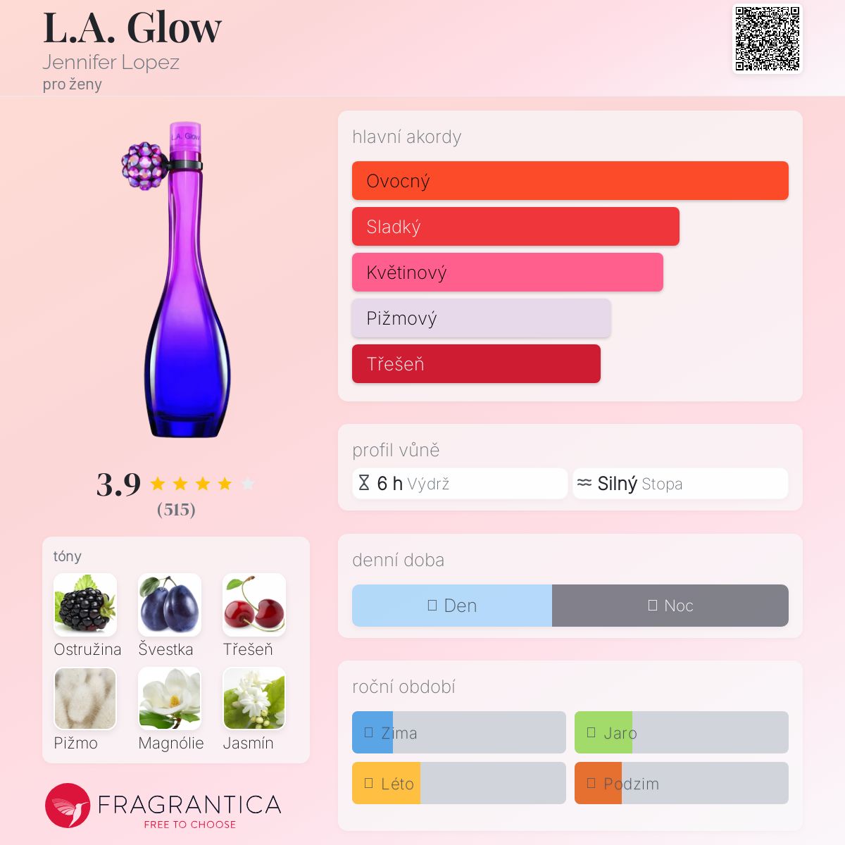 L.A. Glow podle Jennifer Lopez je Floral Fruity vůně pro ženy. L.A. Glow byl/a uveden/a v roce 2010. Vrchní tóny jsou Ostružina, Švestka a Třešeň; střední tóny jsouMagnólie, Jasmín a Pivoňka ; základní tóny jsou Pižmo a Jantar (ambra).