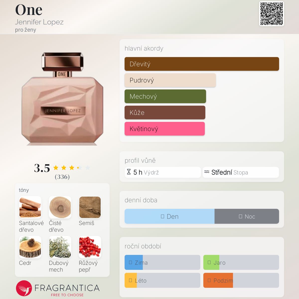 One podle Jennifer Lopez je vůně pro ženy. One byl/a uveden/a v roce 2021. "Nosem" za touto vůní je Frank Voelkl. Vrchní tóny jsou Růžový pepř, Frézie a Broskvový květ; střední tóny jsouČisté dřevo, Cedr a Jasmín ; základní tóny jsou Santalové dřevo, Semiš a Dubový mech.