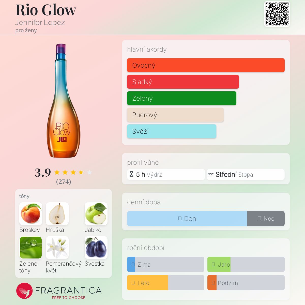 Rio Glow podle Jennifer Lopez je Floral Fruity vůně pro ženy. Rio Glow byl/a uveden/a v roce 2013. Vrchní tóny jsou Broskev, Hruška, Jablko a Zelené tóny; střední tóny jsouPomerančový květ, Švestka a Otočník ; základní tóny jsou Pižmo, Vanilka, Jantar (ambra) a Extrakt z bílého cedru.