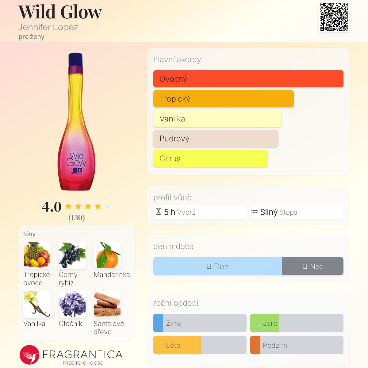 Wild Glow podle Jennifer Lopez je Floral Fruity vůně pro ženy. Wild Glow byl/a uveden/a v roce 2014. Vrchní tóny jsou Tropické ovoce, Černý rybíz a Mandarinka; střední tóny jsouOtočník, Konvalinka a Jasmín mnohokvětý ; základní tóny jsou Vanilka, Santalové dřevo a Pižmo.