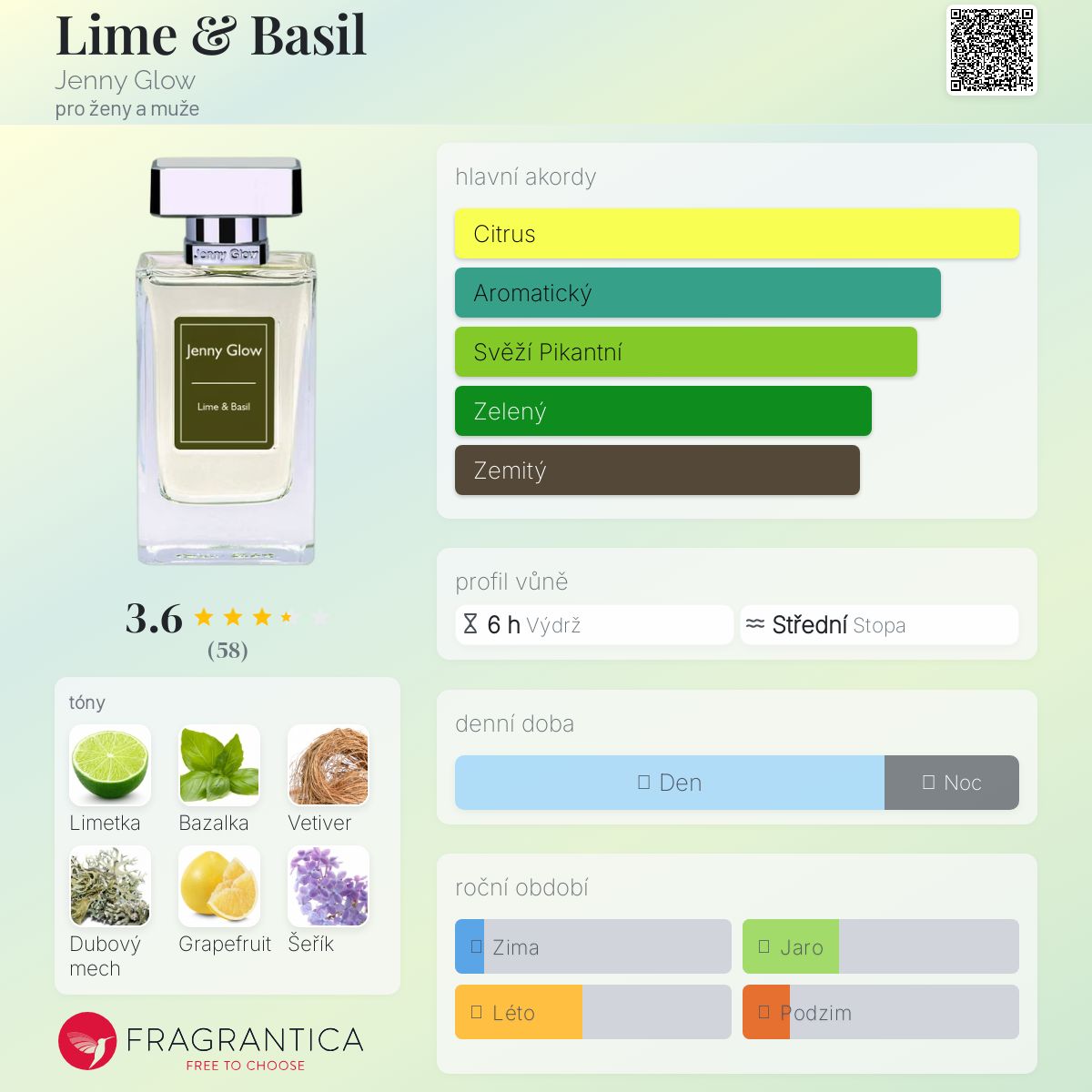 Lime & Basil podle Jenny Glow je vůně pro ženy a muže. Vrchní tóny jsou Limetka, Grapefruit a Mandarinka; střední tóny jsouBazalka, Šeřík a Jasmín ; základní tóny jsou Vetiver, Mech a Pačuli.