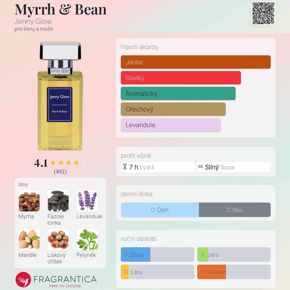 Myrrh & Bean podle Jenny Glow je vůně pro ženy a muže. Vrchní tóny jsou Levandule a Pelyněk; střední tón jeMyrha ; základní tóny jsou Fazole tonka, Mandle a Lískový oříšek.