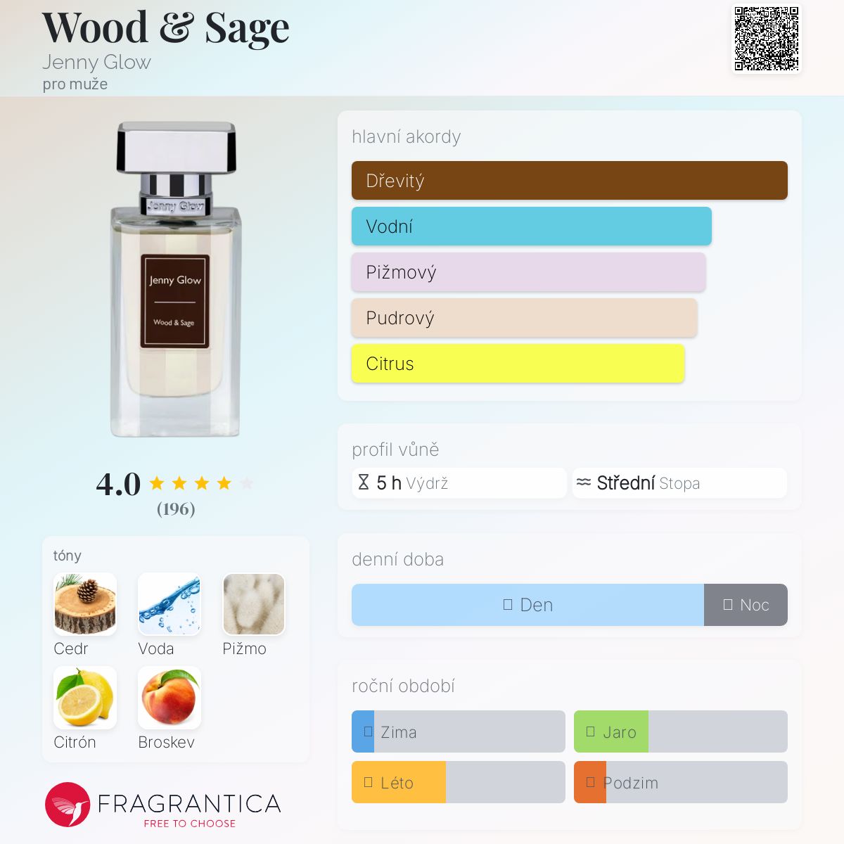 Wood & Sage podle Jenny Glow je vůně pro muže. Vrchní tón je Citrón ; střední tóny jsouVodní tóny a Broskev ; základní tóny jsou Cedr a Pižmo.