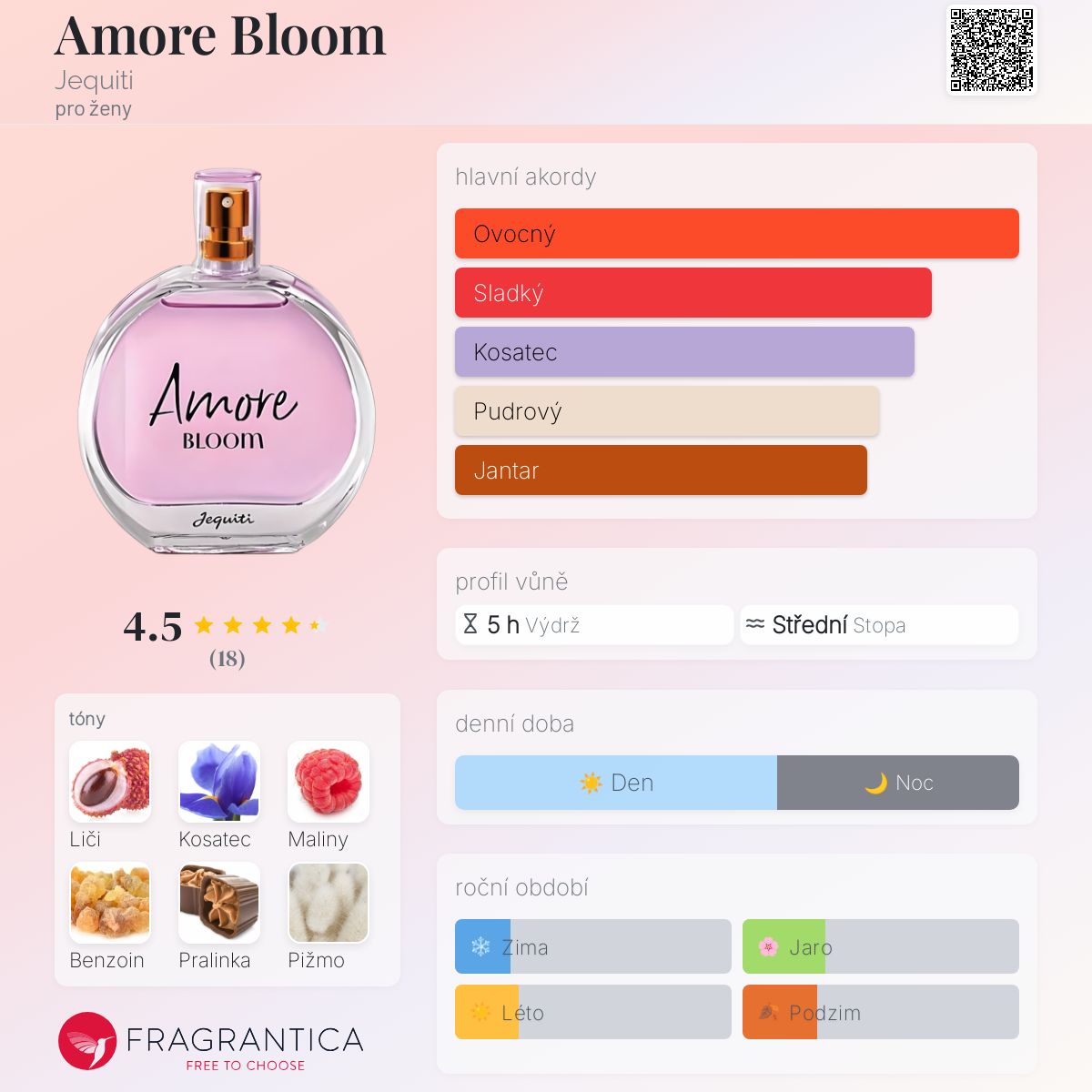 Amore Bloom podle Jequiti je Chypre Floral vůně pro ženy. Toto je nová vůně. Amore Bloom byl/a uveden/a v roce 2025. Vrchní tóny jsou Liči, Maliny, Pralinka a Bergamot; střední tóny jsouKosatec, Jasmín a Růže ; základní tóny jsou Benzoin, Pižmo a Pačuli.