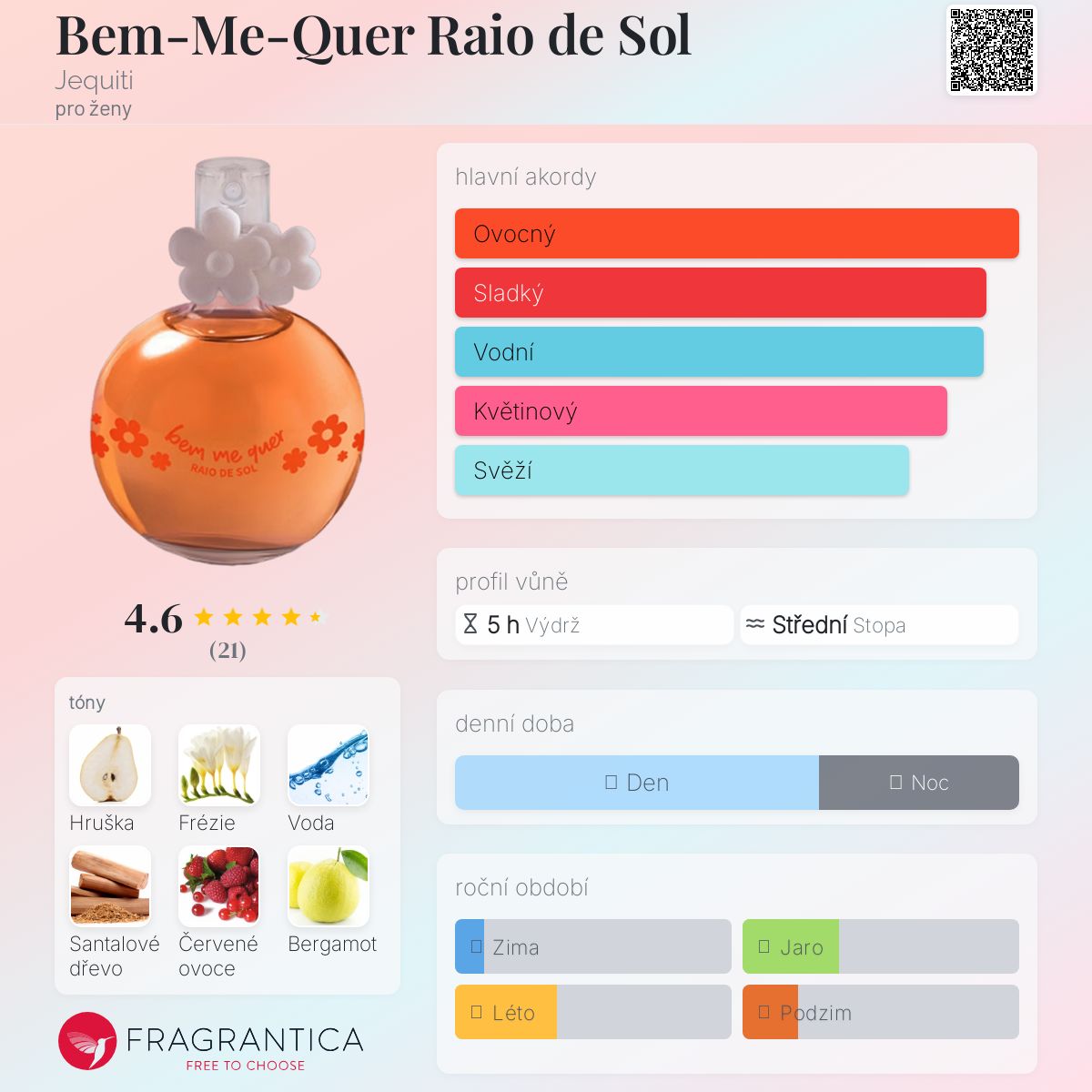 Bem-Me-Quer Raio de Sol podle Jequiti je Orientální Woody vůně pro ženy. Bem-Me-Quer Raio de Sol byl/a uveden/a v roce 2023. Vrchní tóny jsou Hruška, Červené ovoce a Bergamot; střední tóny jsouFrézie, Vodnaté tóny a Růže ; základní tóny jsou Santalové dřevo, Pižmo a Pralinka.