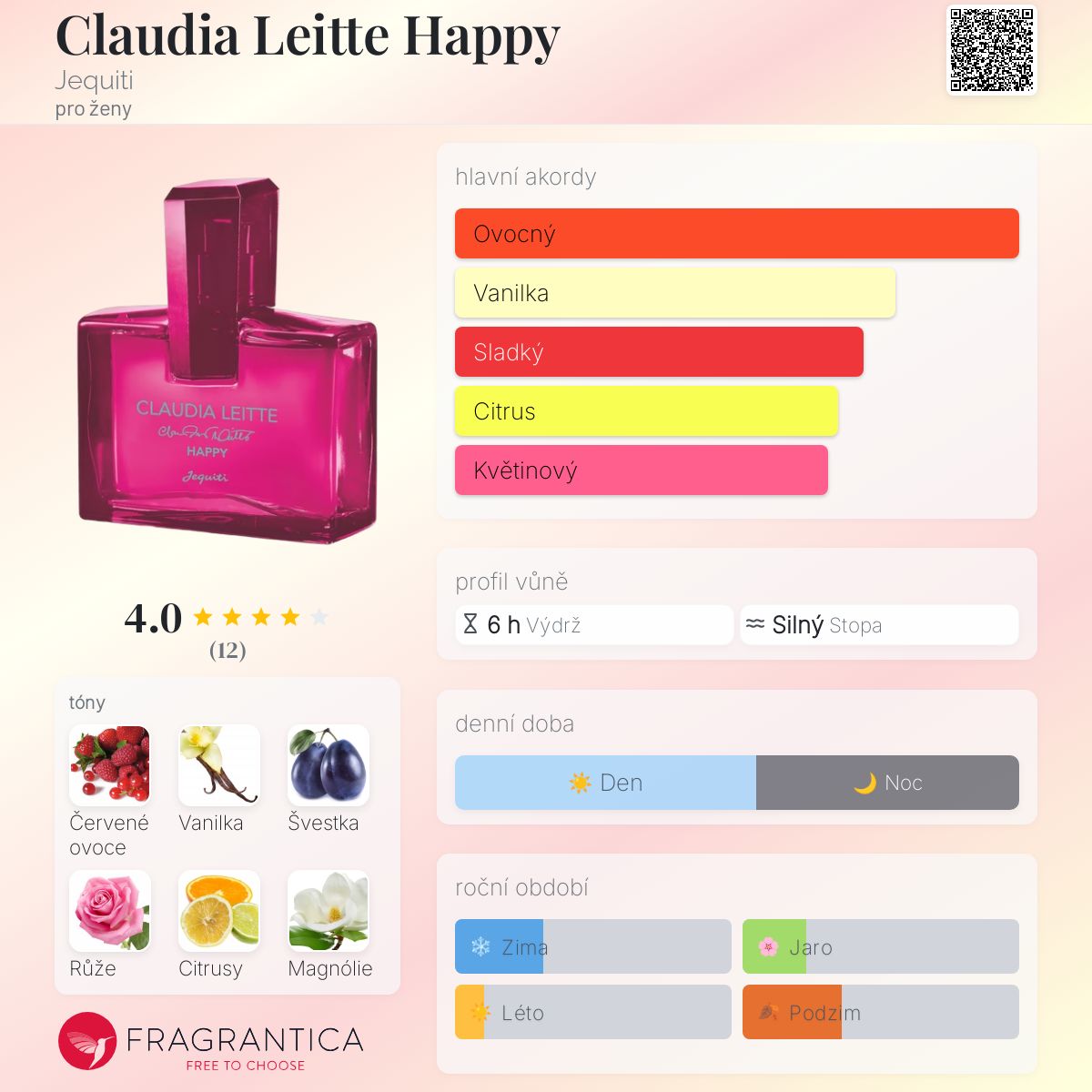 Claudia Leitte Happy podle Jequiti je Orientální vůně pro ženy. Claudia Leitte Happy byl/a uveden/a v roce 2021. Vrchní tóny jsou Červené ovoce a Citrusy; střední tóny jsouŠvestka, Růže a Magnólie ; základní tóny jsou Vanilka, Kašmír, Pižmo a Santalové dřevo.