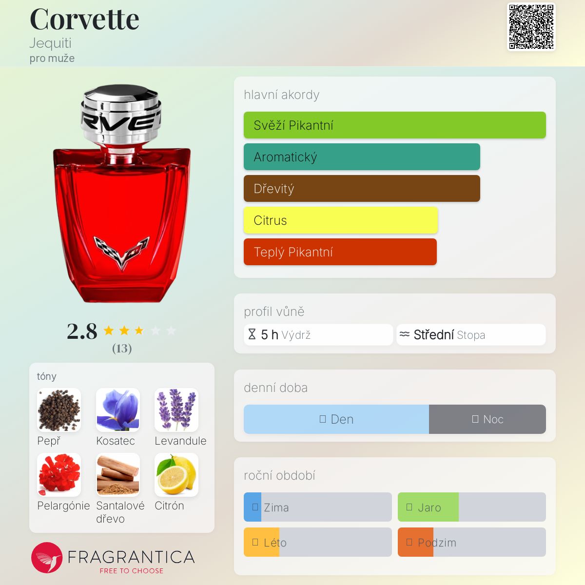 Corvette podle Jequiti je Aromatic Fougere vůně pro muže. Corvette byl/a uveden/a v roce 2021. Vrchní tóny jsou Černý pepř, Citrón a Bergamot; střední tóny jsouKosatec, Levandule a Pelargónie ; základní tóny jsou Santalové dřevo, Papyrus a Vetiver.