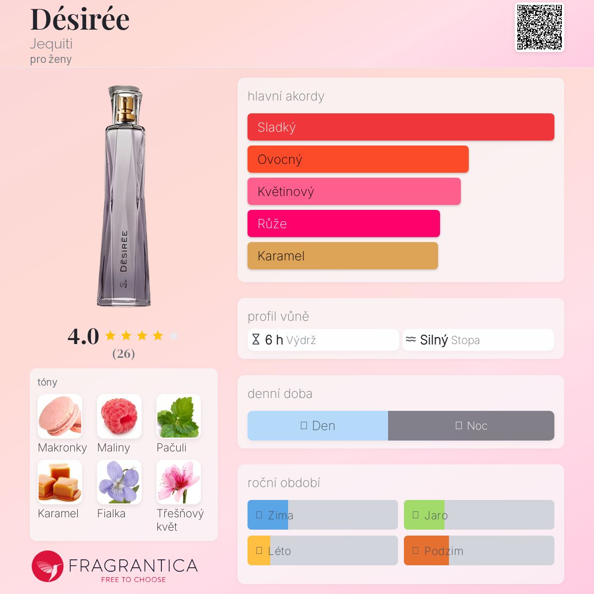 Désirée podle Jequiti je Floral Fruity Gourmand vůně pro ženy. Désirée byl/a uveden/a v roce 2016. Vrchní tóny jsou Fialka, Růžový pepř a Mandarinka; střední tóny jsouMakronky, Maliny, Třešňový květ a Růže ; základní tóny jsou Pačuli, Karamel a Jantar (ambra).