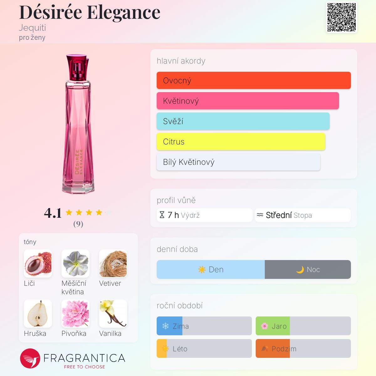 Désirée Elegance podle Jequiti je Chypre vůně pro ženy. Désirée Elegance byl/a uveden/a v roce 2023. Vrchní tóny jsou Liči, Hruška, Sicilský bergamot, Broskev, Mandarinka a Grapefruit; střední tóny jsouMěšíční květina, Pivoňka, Stephanotis, Gardénie a Africký zázvor ; základní tóny jsou Haitský vetiver, Vanilka, Pralinka, Kumarin, Jantar (ambra), Pižmo a Mech.