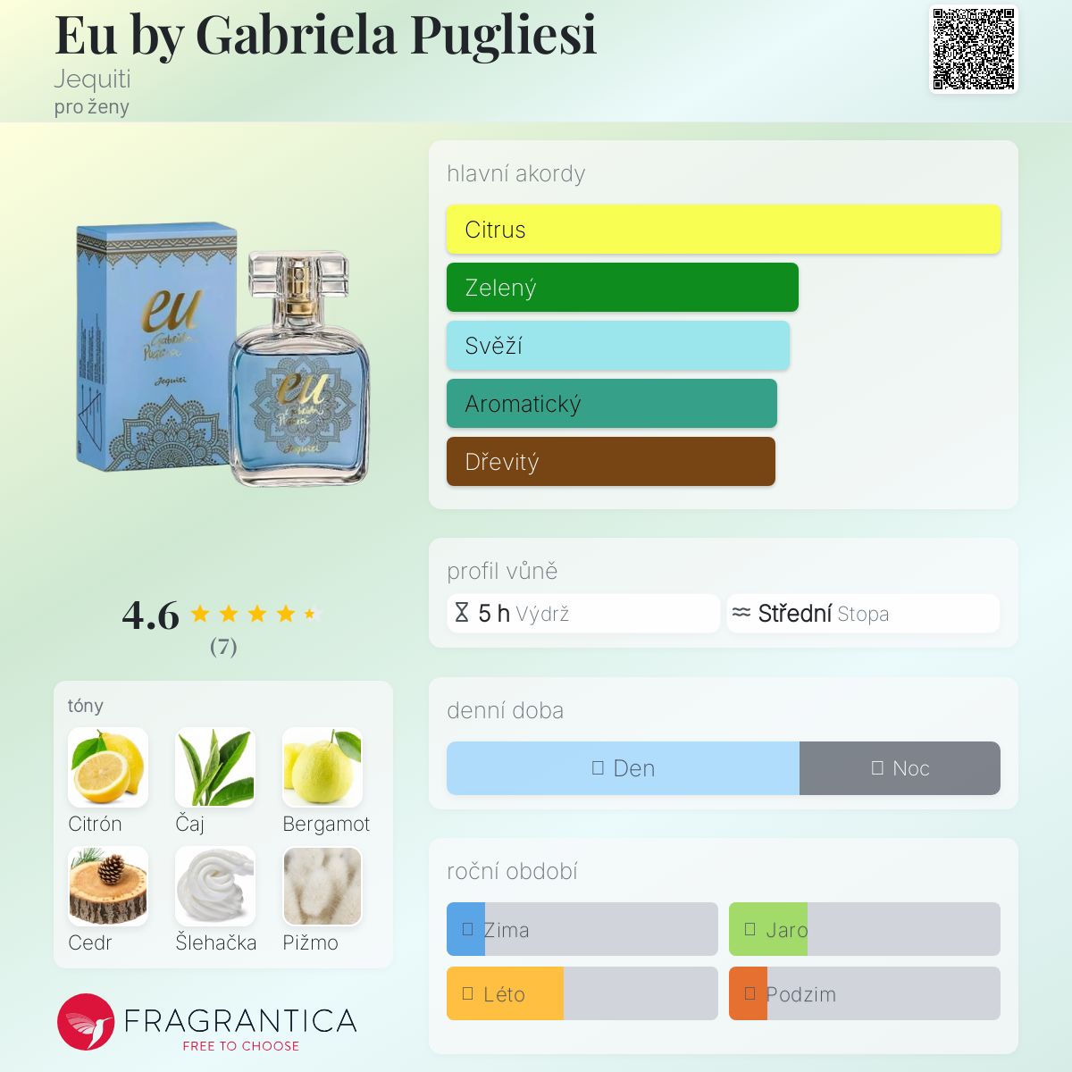 Eu by Gabriela Pugliesi podle Jequiti je Citrus Aromatic vůně pro ženy. Eu by Gabriela Pugliesi byl/a uveden/a v roce 2018. Vrchní tóny jsou Sicilský citron, Bergamot a Zelené jablko; střední tóny jsouČaj, Cedr a Jasmín Sambac ; základní tóny jsou Šlehačka, Pižmo a Vanilka.