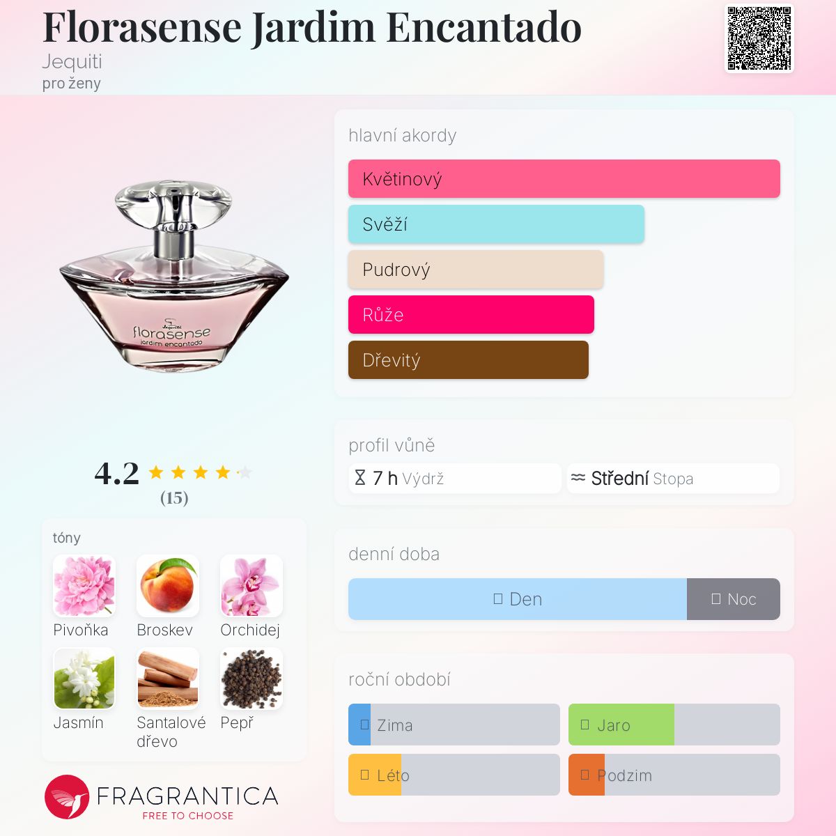 Florasense Jardim Encantado podle Jequiti je Floral vůně pro ženy. Florasense Jardim Encantado byl/a uveden/a v roce 2014. Vrchní tóny jsou Broskev, Pepř a Frézie; střední tóny jsouPivoňka, Divoká orchidej a Jasmín ; základní tóny jsou Santalové dřevo, Jantar (ambra) a Pižmo.