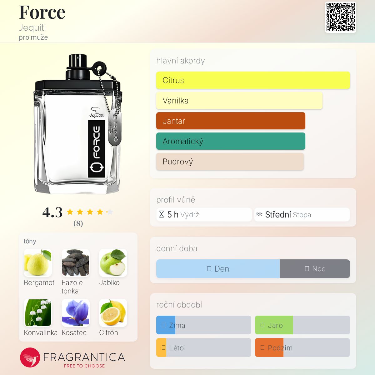 Force podle Jequiti je Floral Woody Musk vůně pro muže. Force byl/a uveden/a v roce 2016. Vrchní tóny jsou Bergamot, Jablko, Citrón a Anýz; střední tóny jsouKonvalinka, Kosatec a Levandule ; základní tóny jsou Fazole tonka, Jantar (ambra), Vanilka a Pižmo.