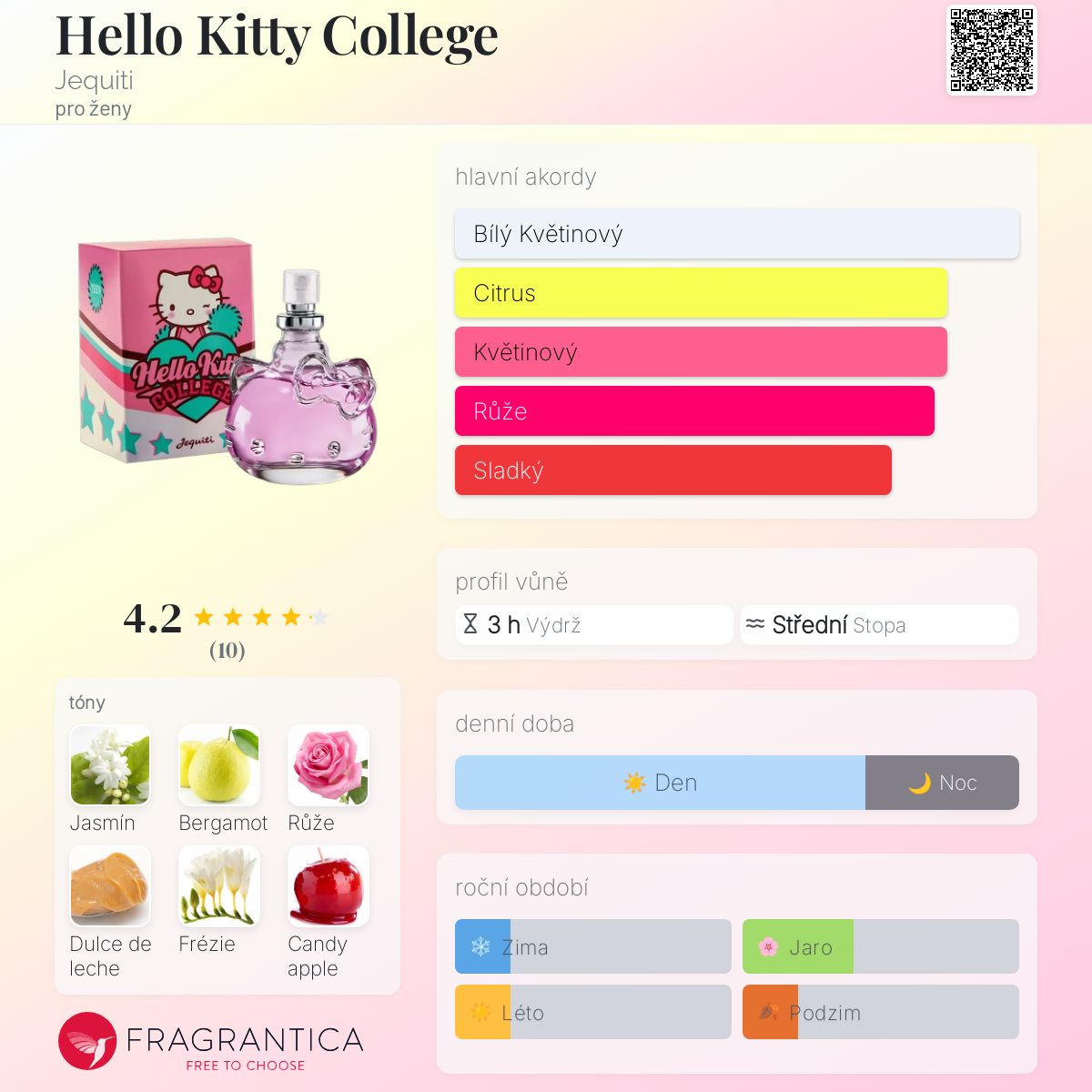 Hello Kitty College podle Jequiti je Floral Fruity vůně pro ženy. Hello Kitty College byl/a uveden/a v roce 2019. Vrchní tóny jsou Bergamot, Hruška a Jahoda; střední tóny jsouJasmín, Růže, Frézie a Sladké jablko ; základní tóny jsou Dulce de leche, Vanilka a Pižmo.