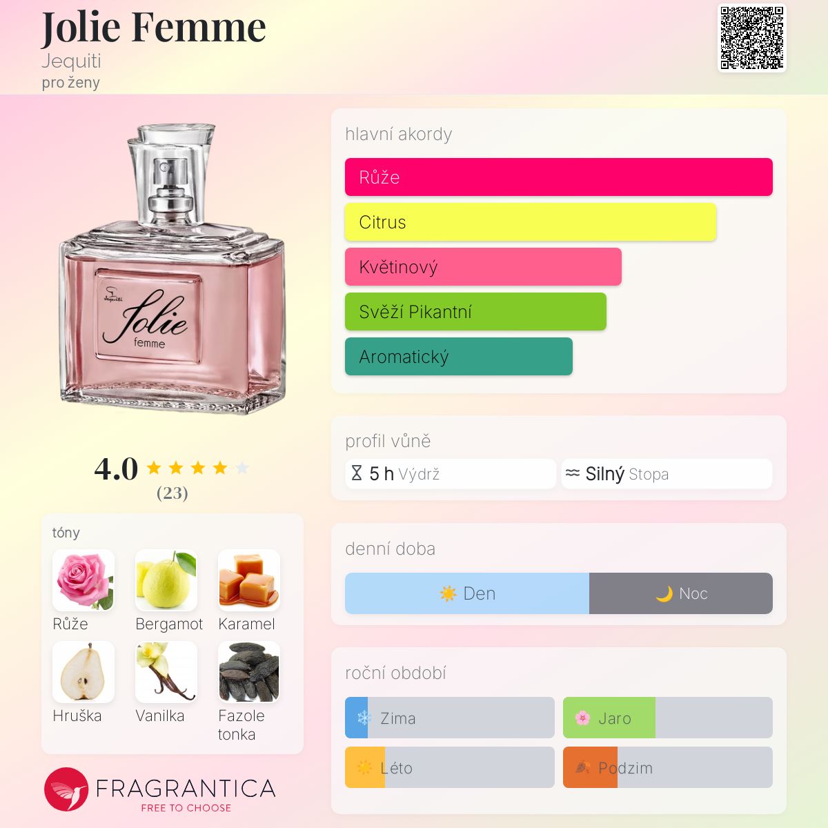 Jolie Femme podle Jequiti je Orientální Floral vůně pro ženy. Jolie Femme byl/a uveden/a v roce 2016. "Nosem" za touto vůní je Eve Miralles. Vrchní tóny jsou Bergamot, Hruška a Zelené jablko; střední tóny jsouRůže, Vanilka a Broskev ; základní tóny jsou Karamel, Fazole tonka a Jantar (ambra).
