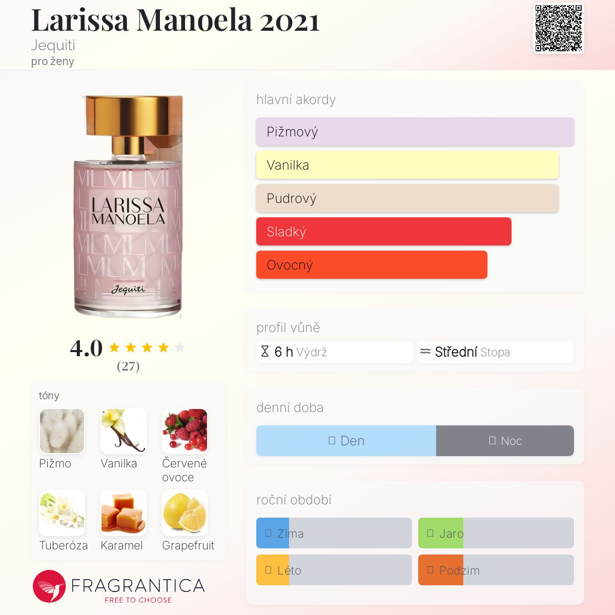 Larissa Manoela 2021 podle Jequiti je Orientální Floral vůně pro ženy. Larissa Manoela 2021 byl/a uveden/a v roce 2021. "Nosem" za touto vůní je Francisca Perez Areias. Vrchní tóny jsou Červené ovoce, Grapefruit a Bergamot; střední tóny jsouTuberóza, Třešňový květ a Santalové dřevo ; základní tóny jsou Pižmo, Vanilka, Karamel, Jantar (ambra) a Fazole tonka.
