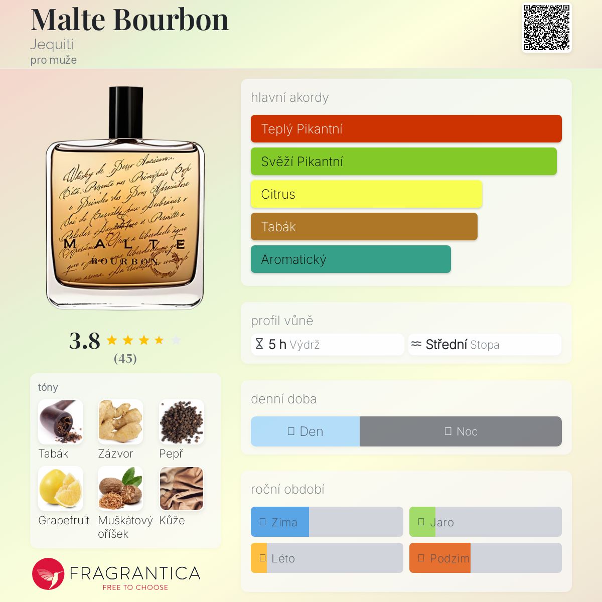 Malte Bourbon podle Jequiti je Woody Spicy vůně pro muže. Malte Bourbon byl/a uveden/a v roce 2016. Vrchní tóny jsou Pepřový olej, Grapefruit, Kardamom, Bambusový list a Bergamot; střední tóny jsouTabák, Zázvor, Kosatec, Pelargónie a Pelyněk ; základní tóny jsou Muškátový oříšek, Kůže, Káva, Jantar (ambra), Pačuli a Fialka.