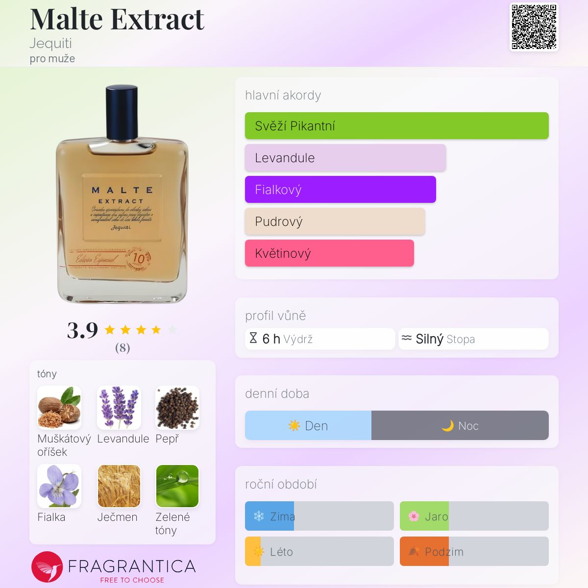 Malte Extract podle Jequiti je Orientální Woody vůně pro muže. Malte Extract byl/a uveden/a v roce 2019. "Nosem" za touto vůní je Guillaume Flavigny. Vrchní tóny jsou Muškátový oříšek, Černý pepř a Bergamot; střední tóny jsouMuškátový oříšek, Fialka a Zelené tóny ; základní tóny jsou Levandule, Fialka a Ječmen.