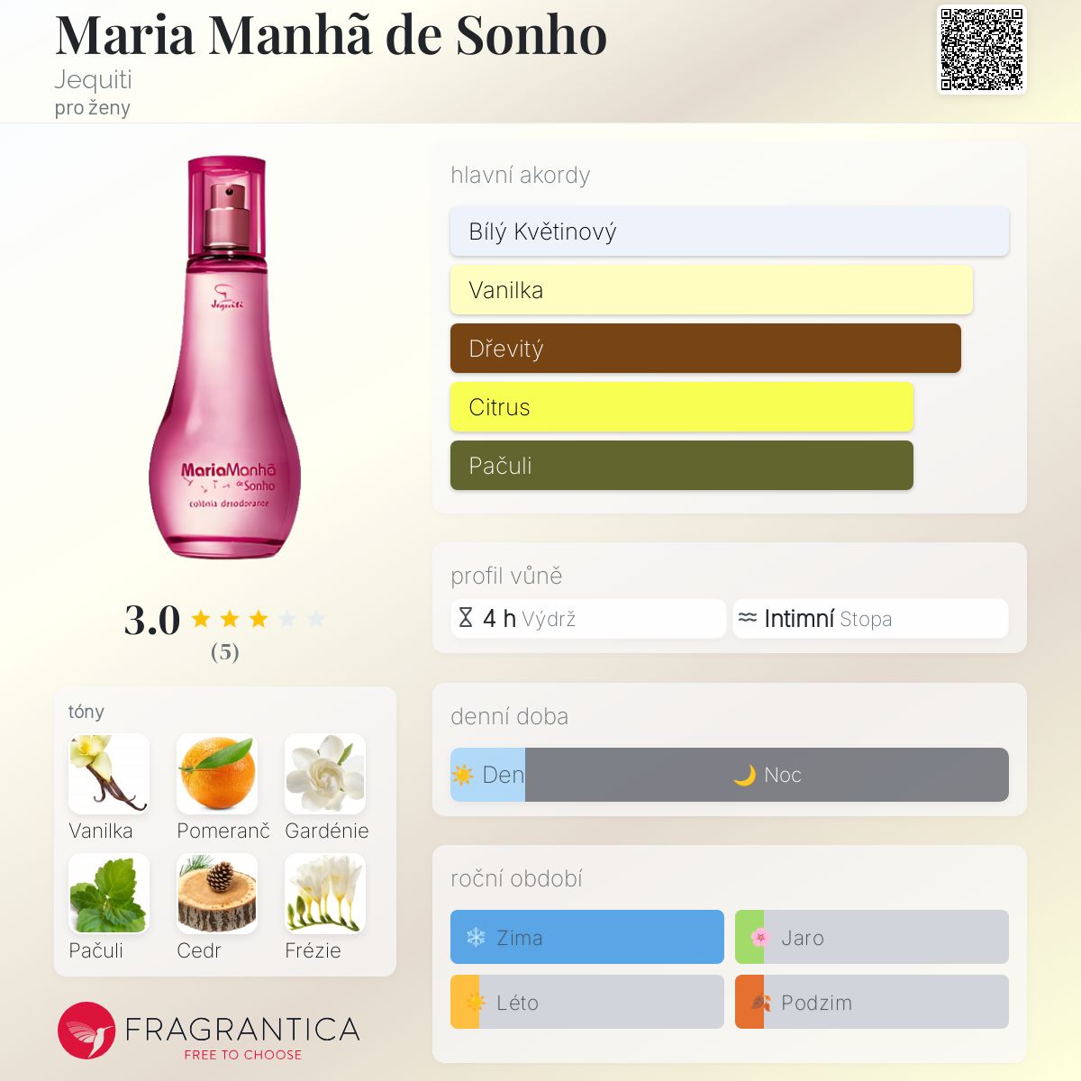 Maria Manhã de Sonho podle Jequiti je Floral Fruity vůně pro ženy. Maria Manhã de Sonho byl/a uveden/a v roce 2012. Vrchní tón je Pomeranč ; střední tóny jsouGardénie, Frézie a Lilie ; základní tóny jsou Vanilka, Pačuli, Cedr a Pižmo.