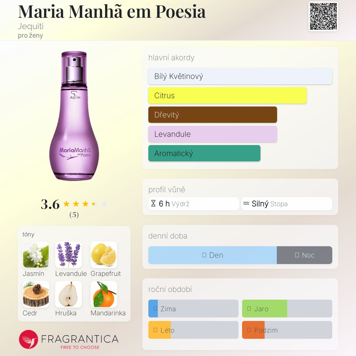 Maria Manhã em Poesia podle Jequiti je Floral Aldehyde vůně pro ženy. Maria Manhã em Poesia byl/a uveden/a v roce 2012. Vrchní tóny jsou Levandule, Grapefruit, Hruška a Mandarinka; střední tóny jsouJasmín, Levandule, Konvalinka a Růže ; základní tóny jsou Cedr, Vanilka a Jantar (ambra).