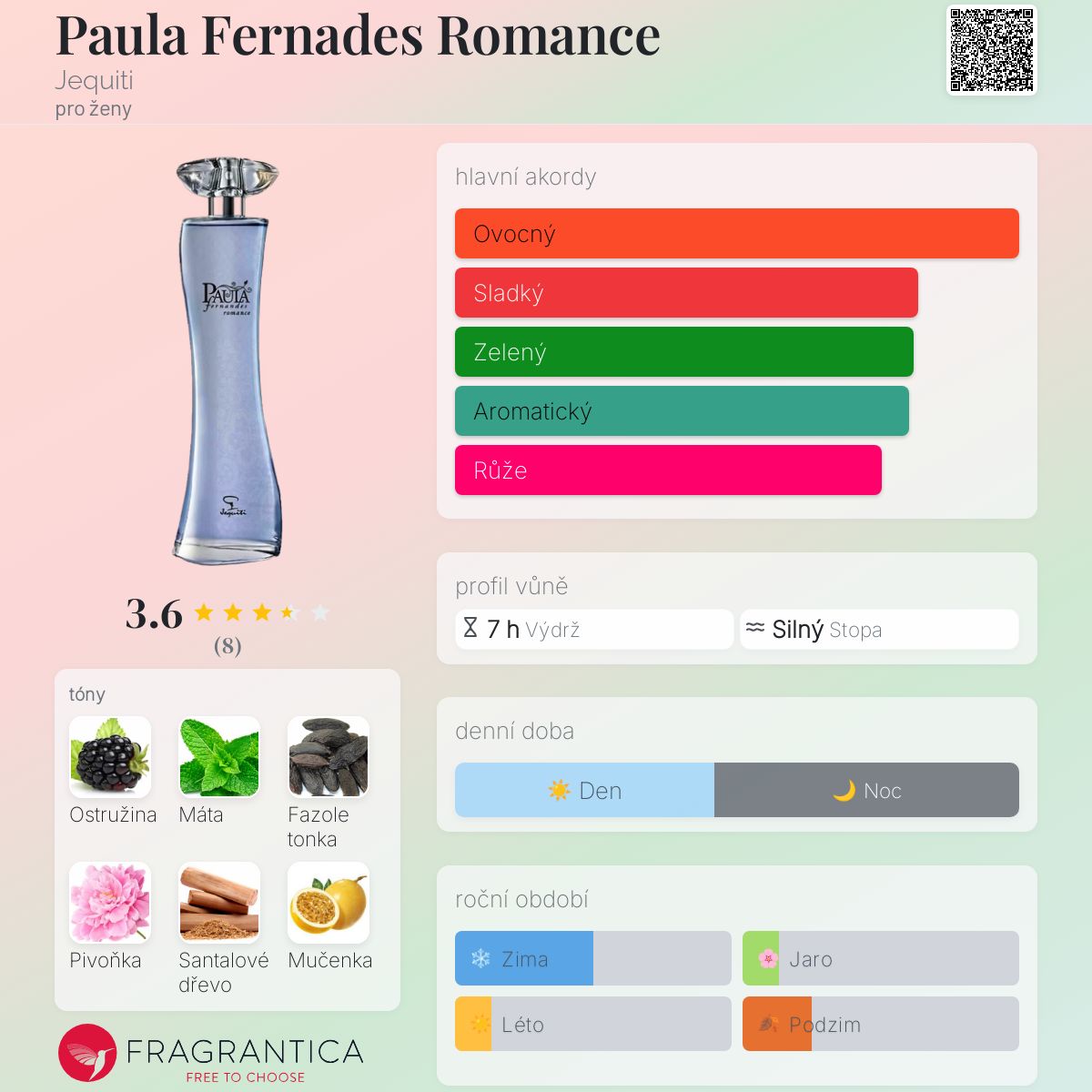 Paula Fernades Romance podle Jequiti je Floral vůně pro ženy. Paula Fernades Romance byl/a uveden/a v roce 2016. "Nosem" za touto vůní je Leandro Petit. Vrchní tóny jsou Ostružina, Máta, Mučenka a Mandarinka; střední tóny jsouPivoňka, Růže, Fialka a Jasmín ; základní tóny jsou Fazole tonka, Santalové dřevo, Jantar (ambra) a Pižmo.