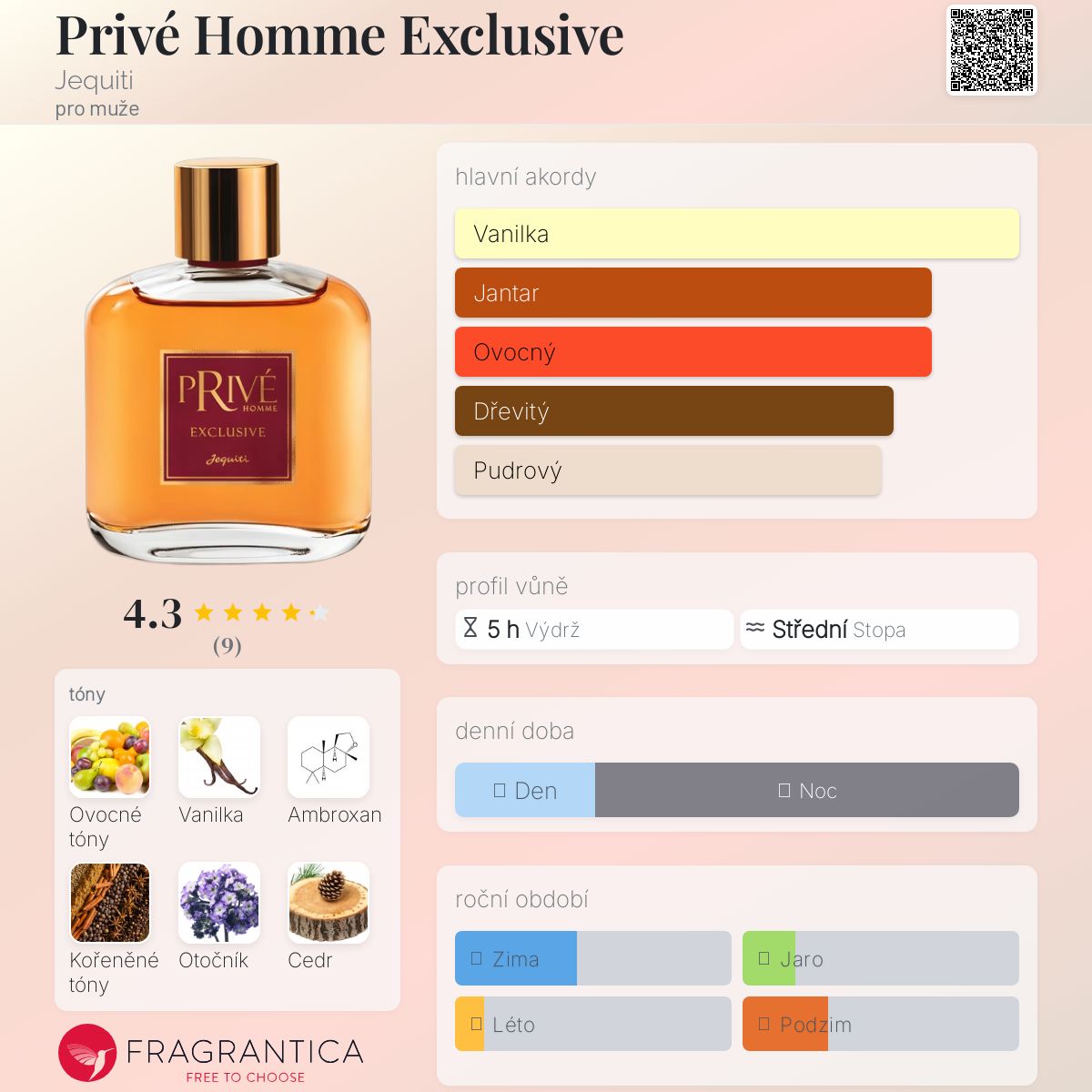 Privé Homme Exclusive podle Jequiti je Orientální vůně pro muže. Privé Homme Exclusive byl/a uveden/a v roce 2022. Privé Homme Exclusive byl/a vytvořen/a Wei Ling a Symrise. Vrchní tóny jsou Ovoce a Koření; střední tóny jsouOtočník a Cedr ; základní tóny jsou Madagaskarská vanilka, Ambroxan a Madagaskarský vetiver.