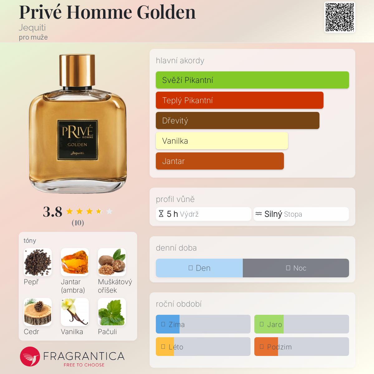 Privé Homme Golden podle Jequiti je Orientální Fougere vůně pro muže. Privé Homme Golden byl/a uveden/a v roce 2019. Vrchní tóny jsou Černý pepř, Muškátový oříšek, Pomelo, Máta, Italská mandarinka a Jablko; střední tóny jsouAtlasový cedr, Skořice, Pomerančový květ, Kůže, Rozmarýn a Zázvor ; základní tóny jsou Jantar (ambra), Madagaskarská vanilka, List indonéského pačuli, Kumarin a Pižmo.