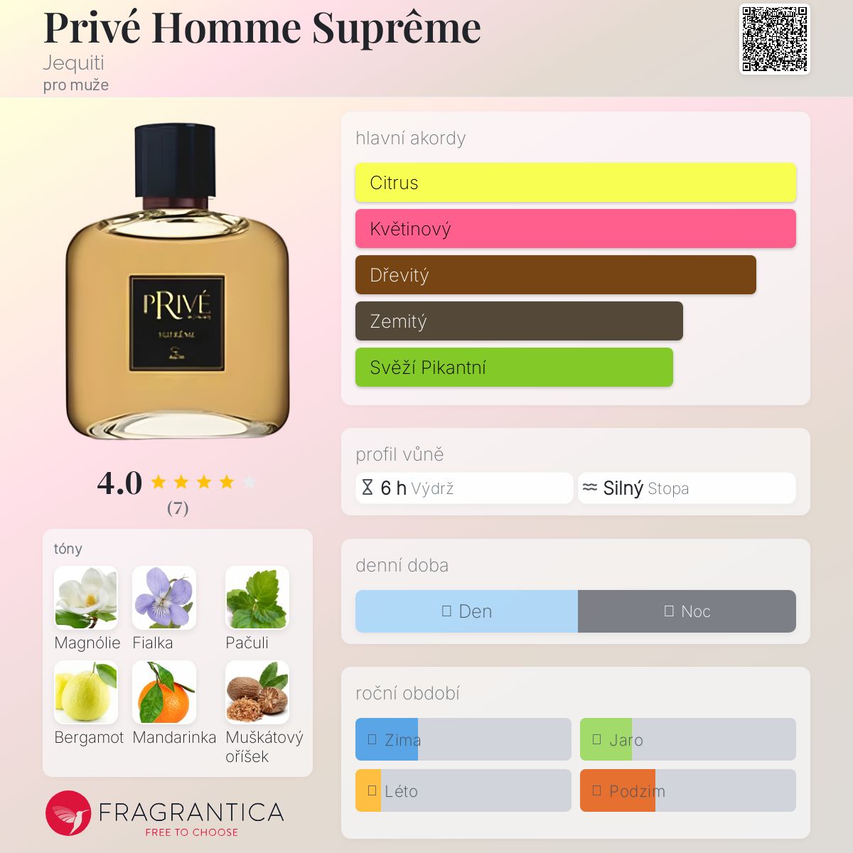 Privé Homme Suprême podle Jequiti je Woody Aromatic vůně pro muže. Privé Homme Suprême byl/a uveden/a v roce 2015. Vrchní tóny jsou Bergamot, Mandarinka a Cedr; střední tóny jsouMagnólie, Fialka a Muškátový oříšek ; základní tóny jsou Pačuli, Dubový mech, Vetiver a Fazole tonka.
