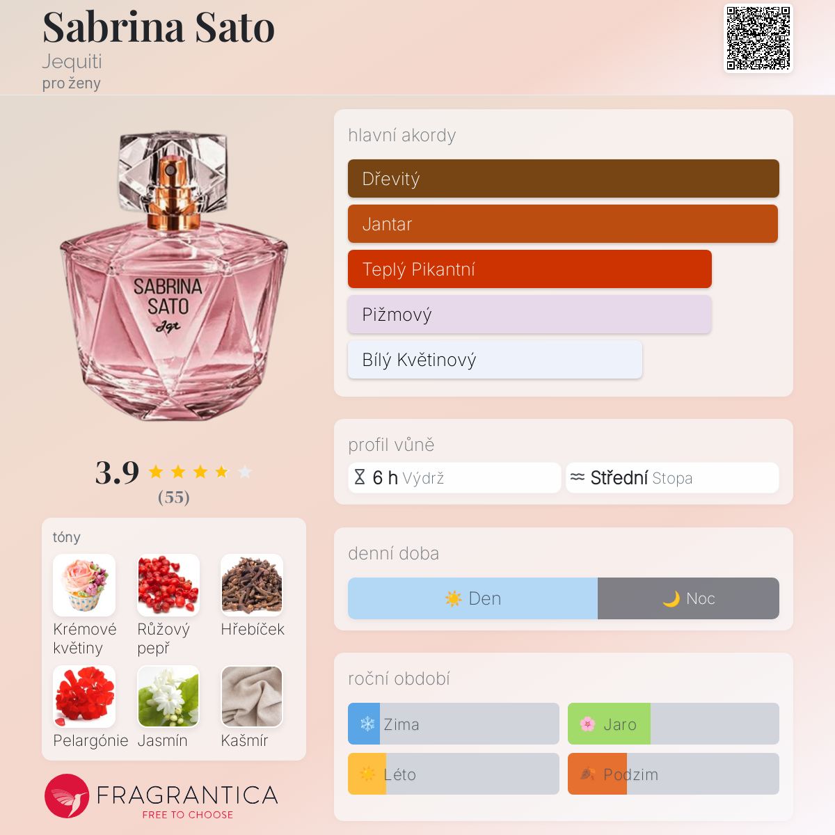 Sabrina Sato podle Jequiti je Floral vůně pro ženy. Sabrina Sato byl/a uveden/a v roce 2022. "Nosem" za touto vůní je Sandra Casagrande. Vrchní tóny jsou Růžový pepř, Hřebíček a Mandarinka; střední tóny jsouKrémové květiny, Pelargónie a Jasmín ; základní tóny jsou Kašmír, Fazole tonka, Jantarové dřevo a Iso E Super.