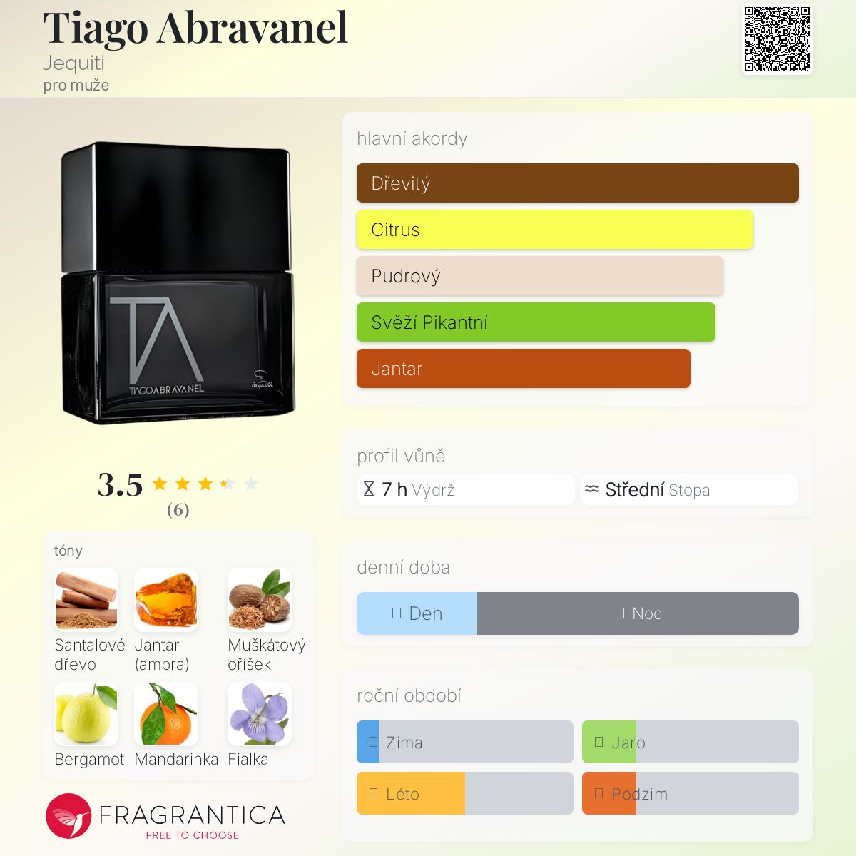 Tiago Abravanel podle Jequiti je Woody vůně pro muže. Tiago Abravanel byl/a uveden/a v roce 2016. Vrchní tóny jsou Bergamot, Mandarinka, Fialka a Grapefruit; střední tóny jsouMuškátový oříšek, Jasmín a Šafrán ; základní tóny jsou Santalové dřevo, Jantar (ambra), Vetiver a Dubový mech.