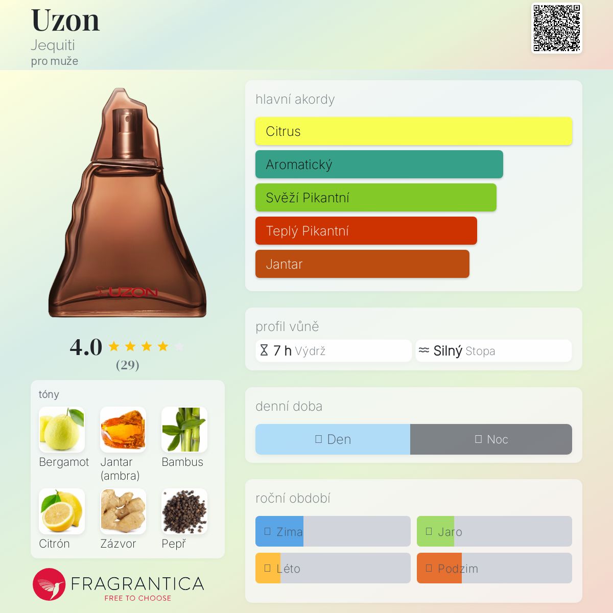 Uzon podle Jequiti je Orientální Woody vůně pro muže. Uzon byl/a uveden/a v roce 2008. Vrchní tóny jsou Bergamot, Bambus a Citrón; střední tóny jsouZázvor, Černý pepř a Šalvěj muškátová ; základní tóny jsou Jantar (ambra) a Vetiver.