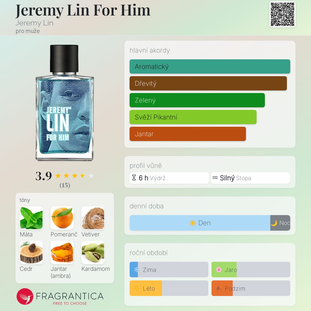 Jeremy Lin For Him podle Jeremy Lin je Woody Aromatic vůně pro muže. Jeremy Lin For Him byl/a uveden/a v roce 2019. Vrchní tóny jsou Máta, Sladký pomeranč a Kardamom; střední tóny jsouVetiver, Cedr a Muškátový oříšek ; základní tóny jsou Jantar (ambra), Pižmo, Santalové dřevo a Kadidlo.