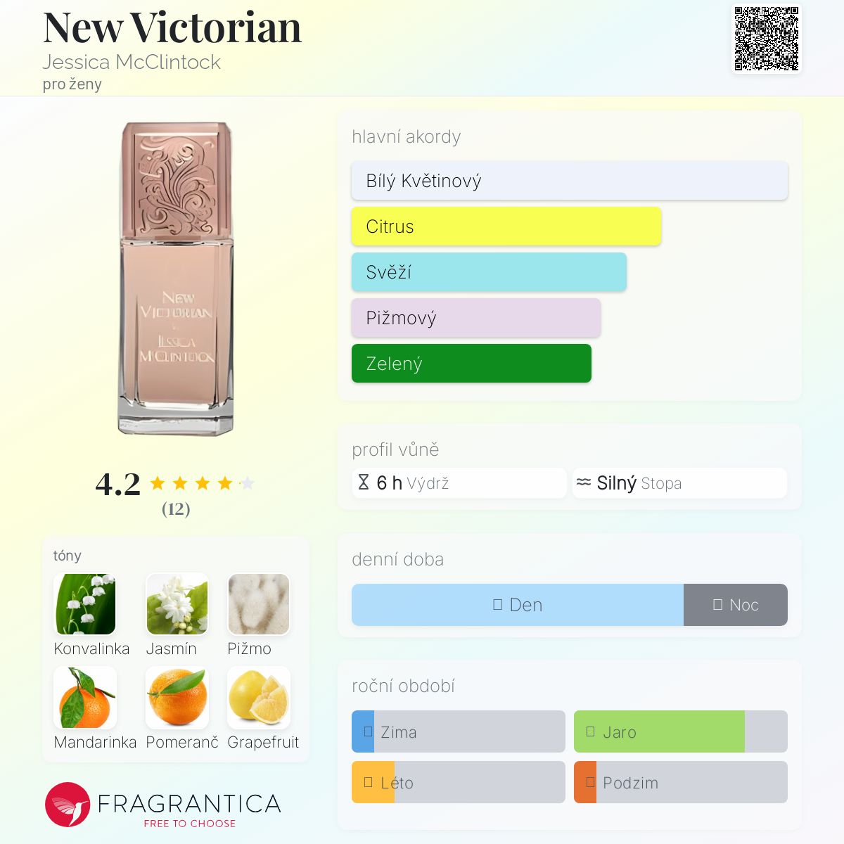 New Victorian podle Jessica McClintock je Floral vůně pro ženy. New Victorian byl/a uveden/a v roce 2006. Vrchní tóny jsou Mandarinka, Pomeranč a Grapefruit; střední tóny jsouKonvalinka a Jasmín ; základní tón je Pižmo.