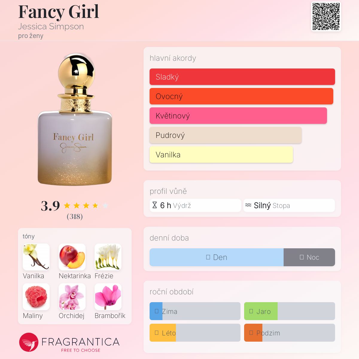 Fancy Girl podle Jessica Simpson je Floral Fruity vůně pro ženy. Fancy Girl byl/a uveden/a v roce 2014. Vrchní tóny jsou Nektarinka, Maliny a Hruška; střední tóny jsouFrézie, Orchidej a Brambořík ; základní tóny jsou Vanilka, Pižmo, Jantar (ambra) a Santalové dřevo.