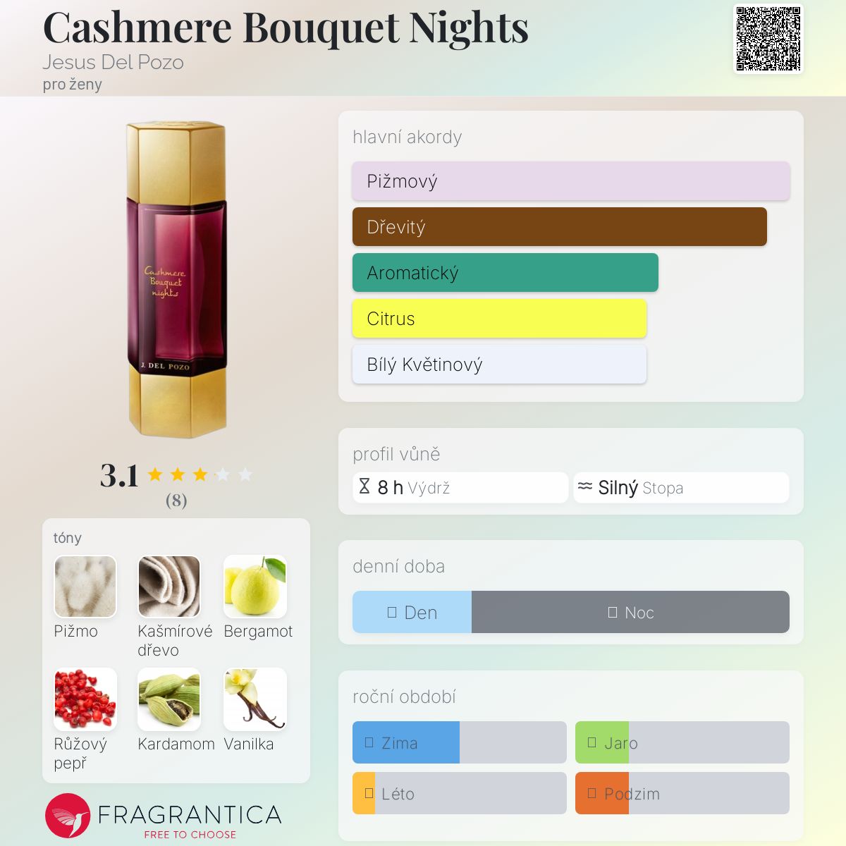 Cashmere Bouquet Nights podle Jesus Del Pozo je Orientální Floral vůně pro ženy. Cashmere Bouquet Nights byl/a uveden/a v roce 2019. Vrchní tóny jsou Bergamot, Růžový pepř a Kardamom; střední tóny jsouPižmo, Vanilkový květ, Neroli a Bílé květy ; základní tóny jsou Kašmírové dřevo, Agarové dřevo (oud), Vetiver a Pačuli.