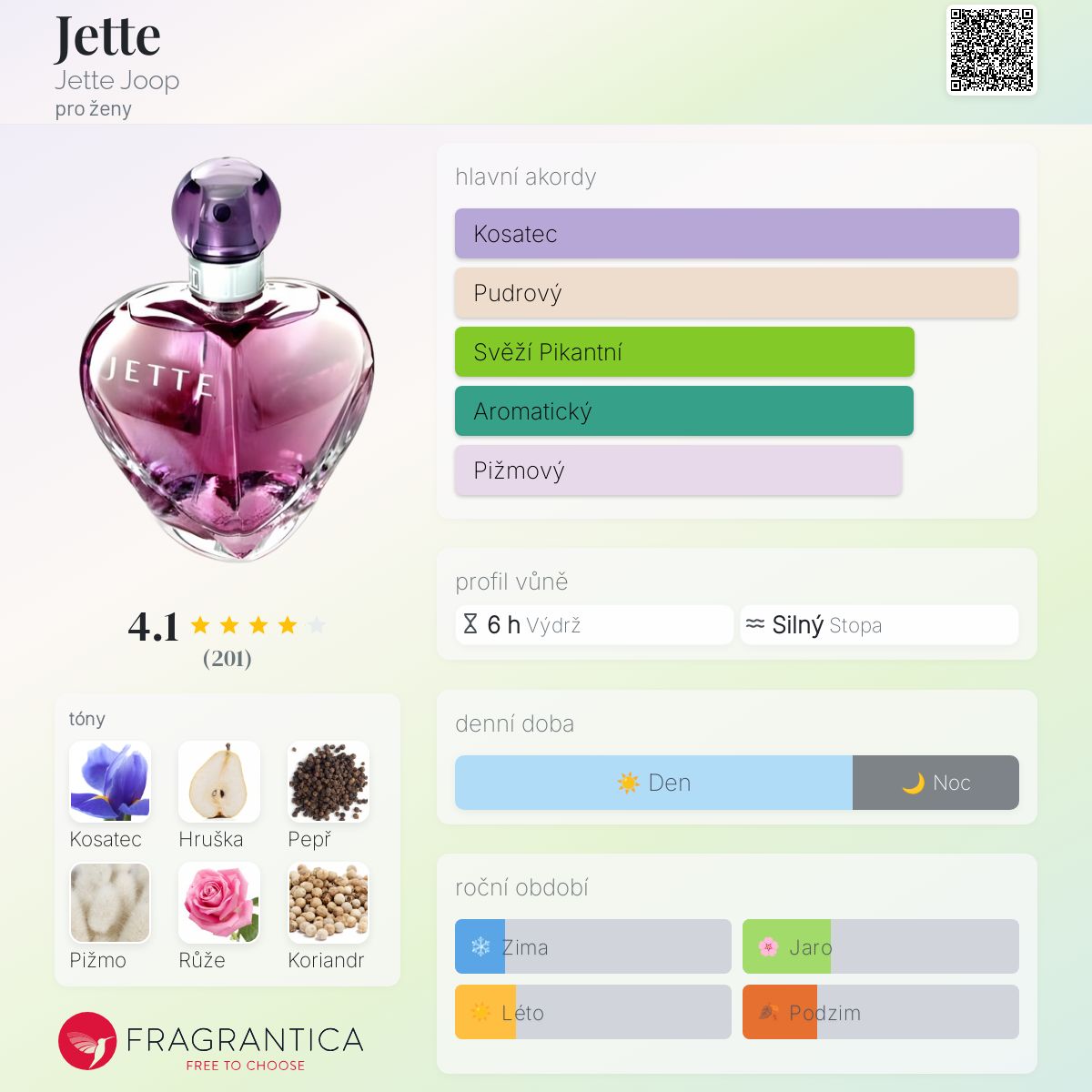Jette podle Jette Joop je Floral Woody Musk vůně pro ženy. Jette byl/a uveden/a v roce 2005. "Nosem" za touto vůní je Olivier Cresp. Vrchní tóny jsou Hruška, Pepř a Koriandr; střední tóny jsouKosatec a Bulharská růže ; základní tóny jsou Pižmo, Fazole tonka a Cedr.
