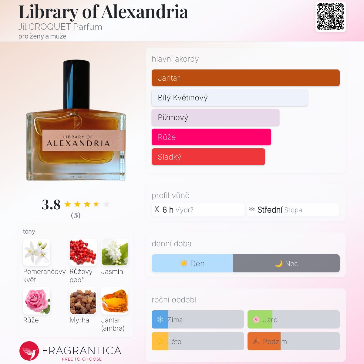 Library of Alexandria podle Jil CROQUET Parfum je Orientální Floral vůně pro ženy a muže. Library of Alexandria byl/a uveden/a v roce 2020. "Nosem" za touto vůní je Jil CROQUET. Vrchní tóny jsou Pomerančový květ a Růžový pepř; střední tóny jsouJasmín a Růže ; základní tóny jsou Myrha, Jantar (ambra), Kadidlo a Pižmo.