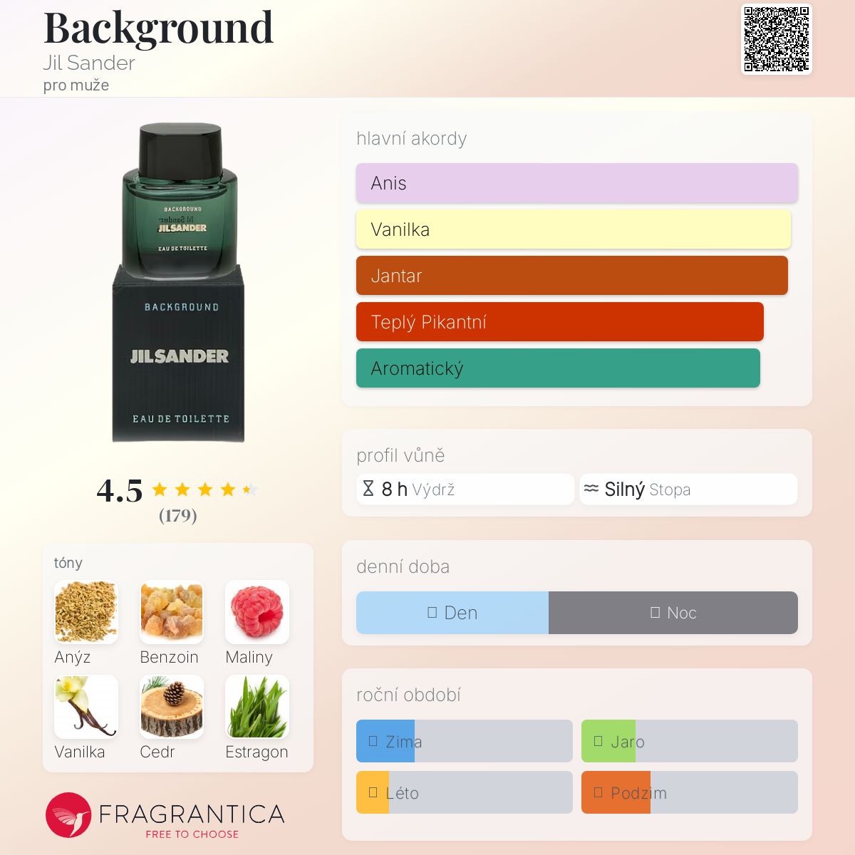 Background podle Jil Sander je Orientální Fougere vůně pro muže. Background byl/a uveden/a v roce 1993. Vrchní tóny jsou Anýz, Maliny, Estragon, Levandule, Bergamot a Citrón; střední tóny jsouSkořice, Karafiát, Jasmín, Konvalinka, Otočník a Růže ; základní tóny jsou Benzoin, Vanilka, Cedr, Fazole tonka, Jantar (ambra), Santalové dřevo a Pižmo.
