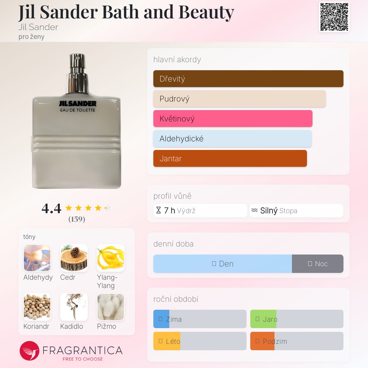 Jil Sander Bath and Beauty podle Jil Sander je Chypre Floral vůně pro ženy. Jil Sander Bath and Beauty byl/a uveden/a v roce 1981. "Nosem" za touto vůní je Jacques Artarit. Vrchní tóny jsou Aldehydy, Bergamot, Fialka, Ovocné tóny a Citrón; střední tóny jsouYlang-Ylang, Koriandr, Kosatec, Karafiát, Růže, Jasmín, Med a Orchidej ; základní tóny jsou Cedr, Kadidlo, Pižmo, Santalové dřevo, Benzoin a Jantar (ambra).