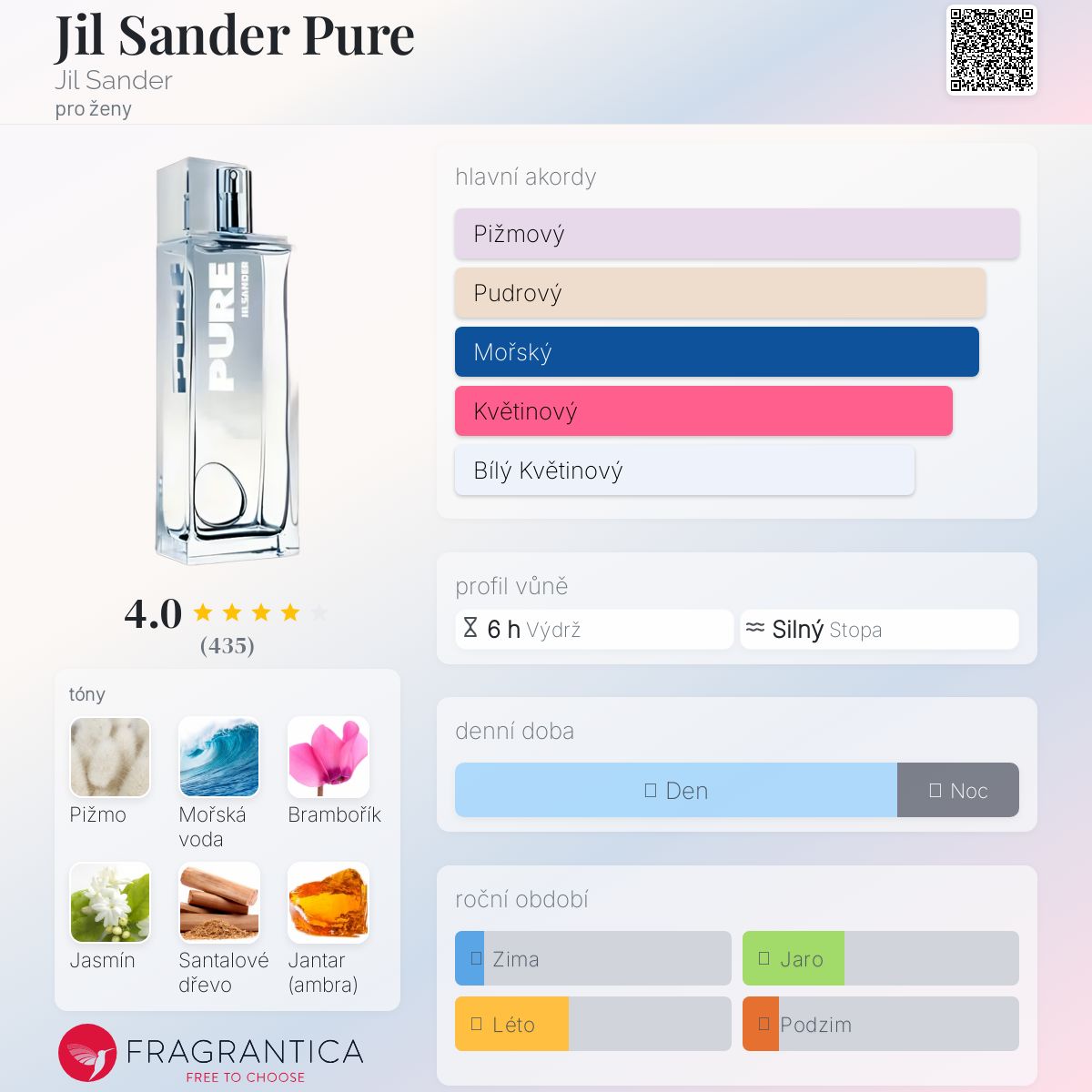 Jil Sander Pure podle Jil Sander je Floral Woody Musk vůně pro ženy. Jil Sander Pure byl/a uveden/a v roce 2003. Jil Sander Pure byl/a vytvořen/a Nathalie Lorson a Ilias Ermenidis. Vrchní tón je Mořské tóny ; střední tóny jsouBílé pižmo a Jasmín ; základní tóny jsou Brambořík, Santalové dřevo a Jantar (ambra).